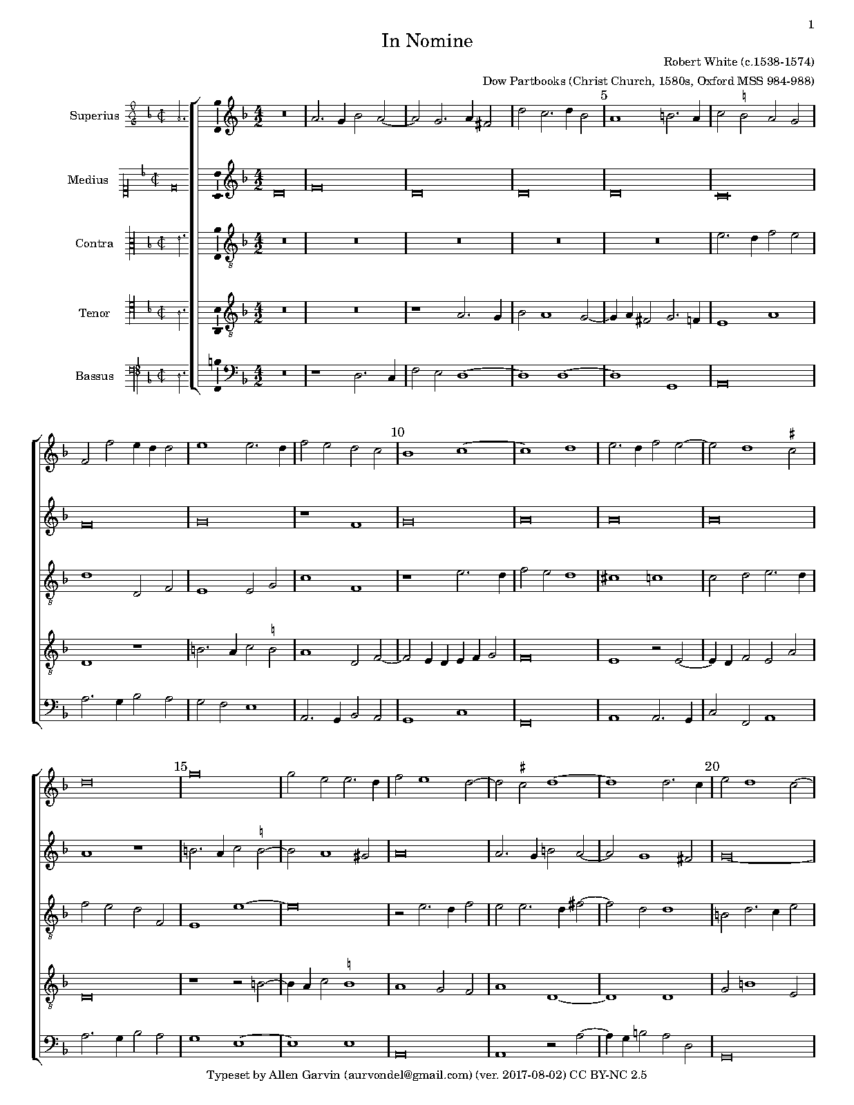 According to the thematic index of the VdGS UK, this piece, the only 5-part In Nomine of White, survives in a dozen manuscript sources.