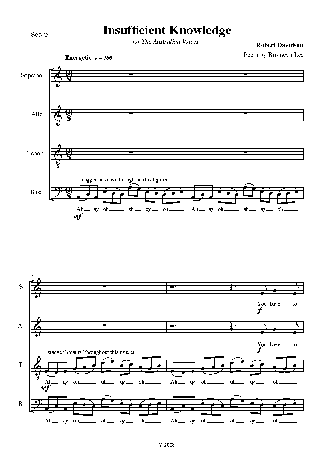 SATB choral setting of a poem by Brisbane poet Bronwyn Lea about uncertainties in forming relationships. Commissioned by The Australian Voices.