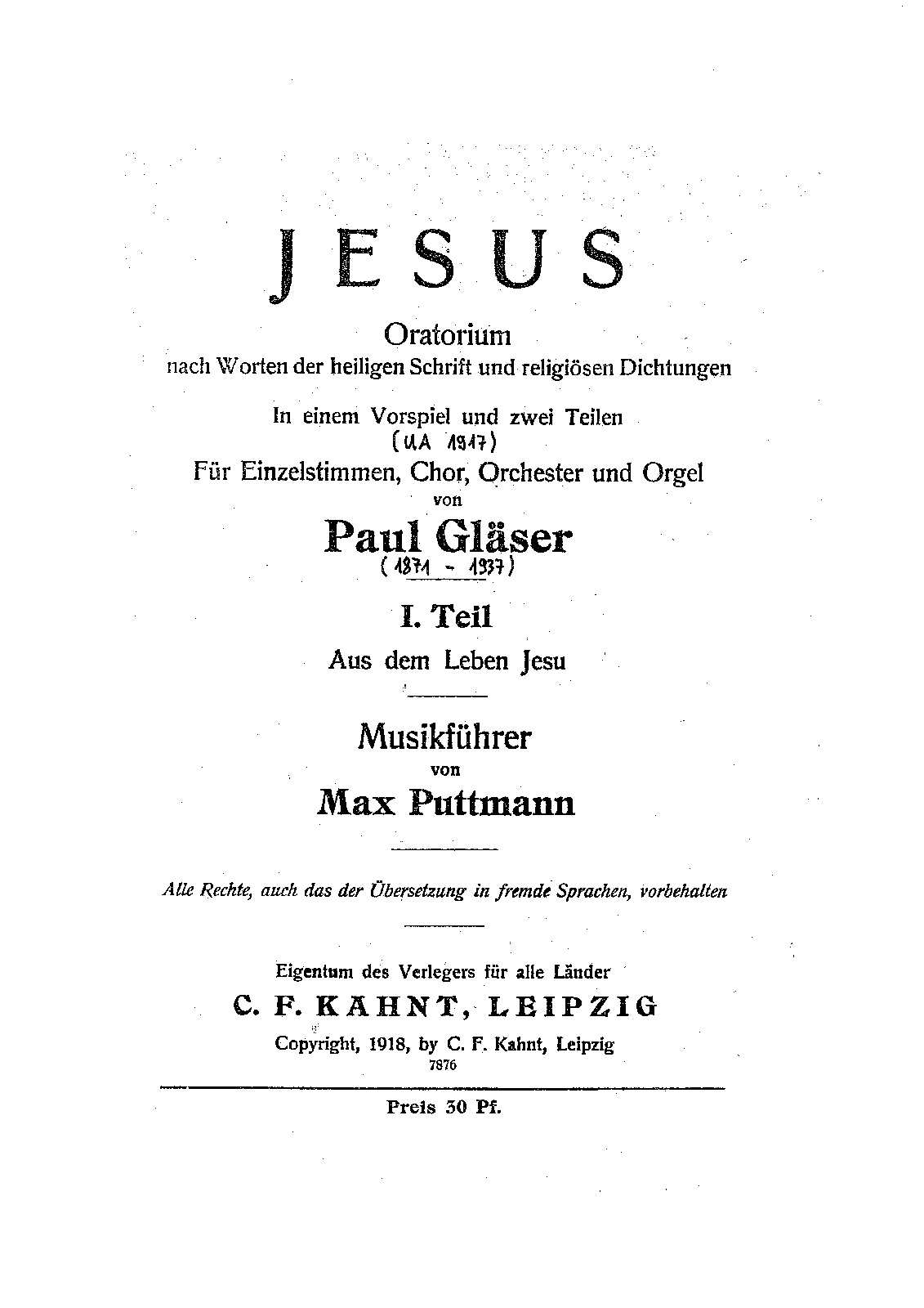 Oratorium nach Worten der Heiligen Schrift und religiösen Dichtungen in einem Vorspiel und zwei Teilen für Soli, Chor, Orchester und Orgel