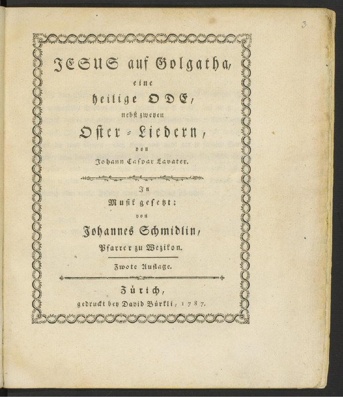 | Alternative. Title | Jesus auf Golgatha, eine heilige Ode, nebst zweyen Oster-Liedern, ihrer Vortreflichkeit wegen in Music gesetzt |