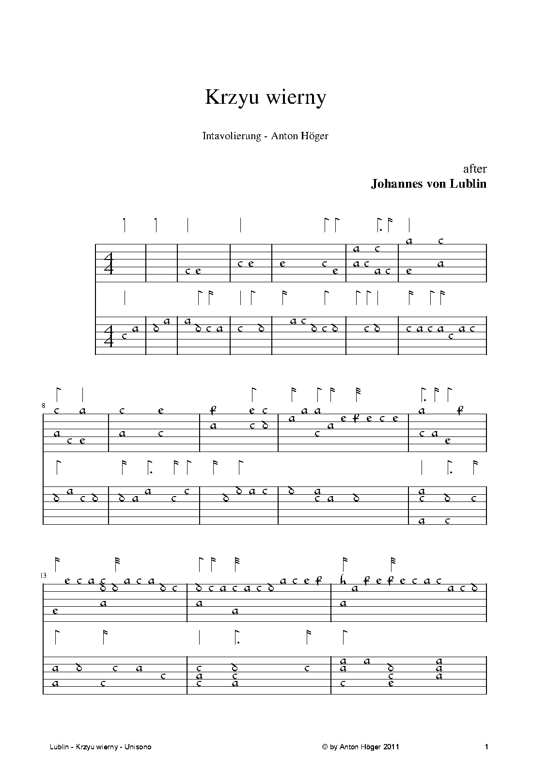 Source: Ms. 1716, Academy of Sciences in Cracow, Tabulatura Ioannis de Lubliyn fol.20v As composer stated N.Z. Intavolation in french Lute-tabulatur for 2 lutes (Unisono) with Diminuitions in the tradition of the great luteplayers of the 16. Century. If performed I would look forward about a small reference to my efforts.