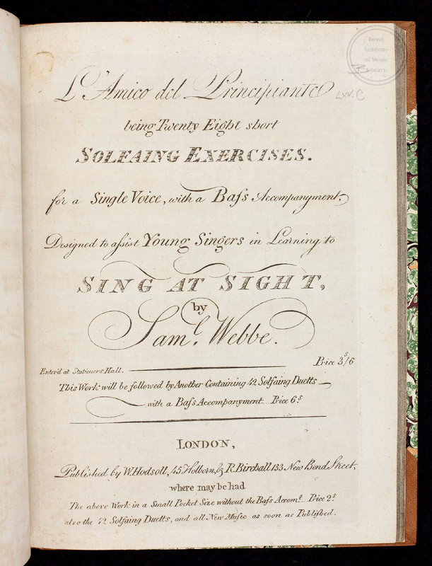 L'Amico del Principiante being Twenty Eight short Solfaing Exercises. for a Single Voice, with a Bass Accompanyment, Designed to assist Young Singers in Learning to Sing at Sight, by Saml. Webbe