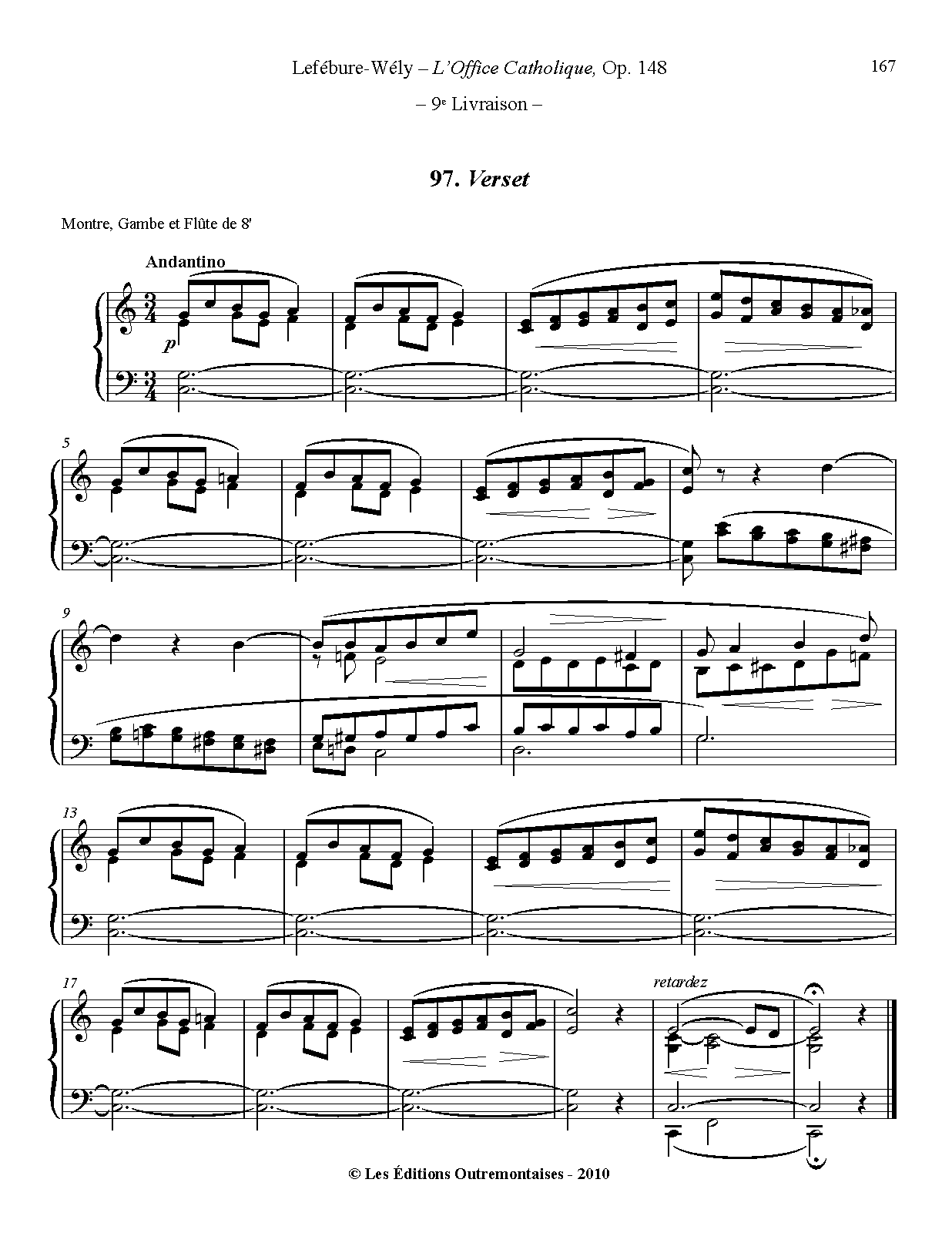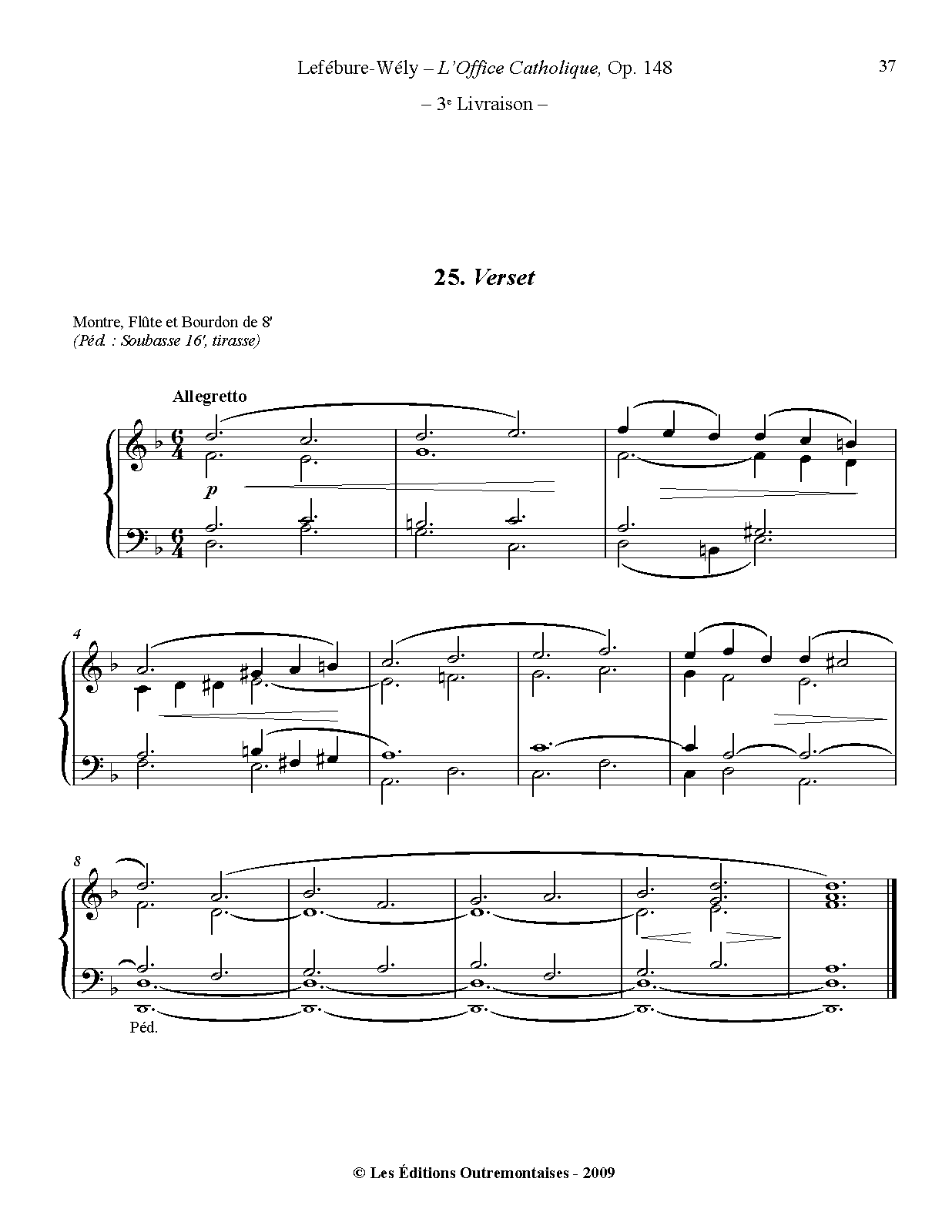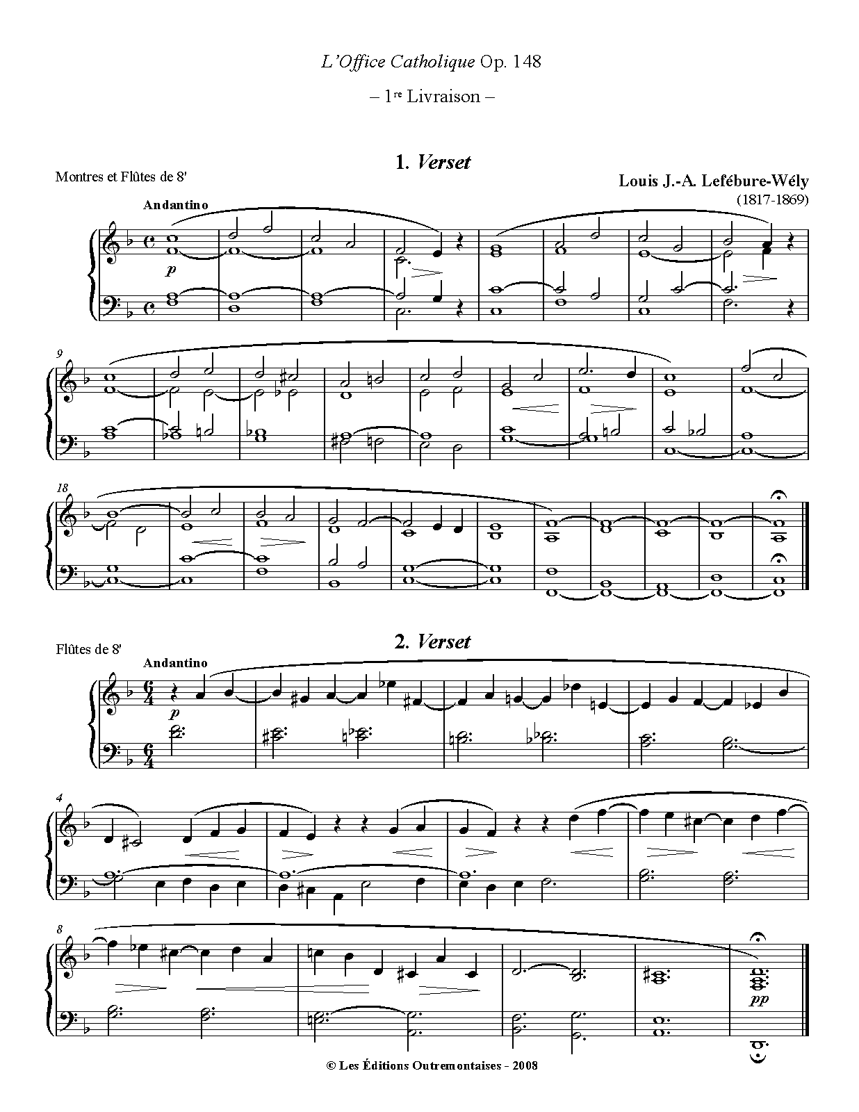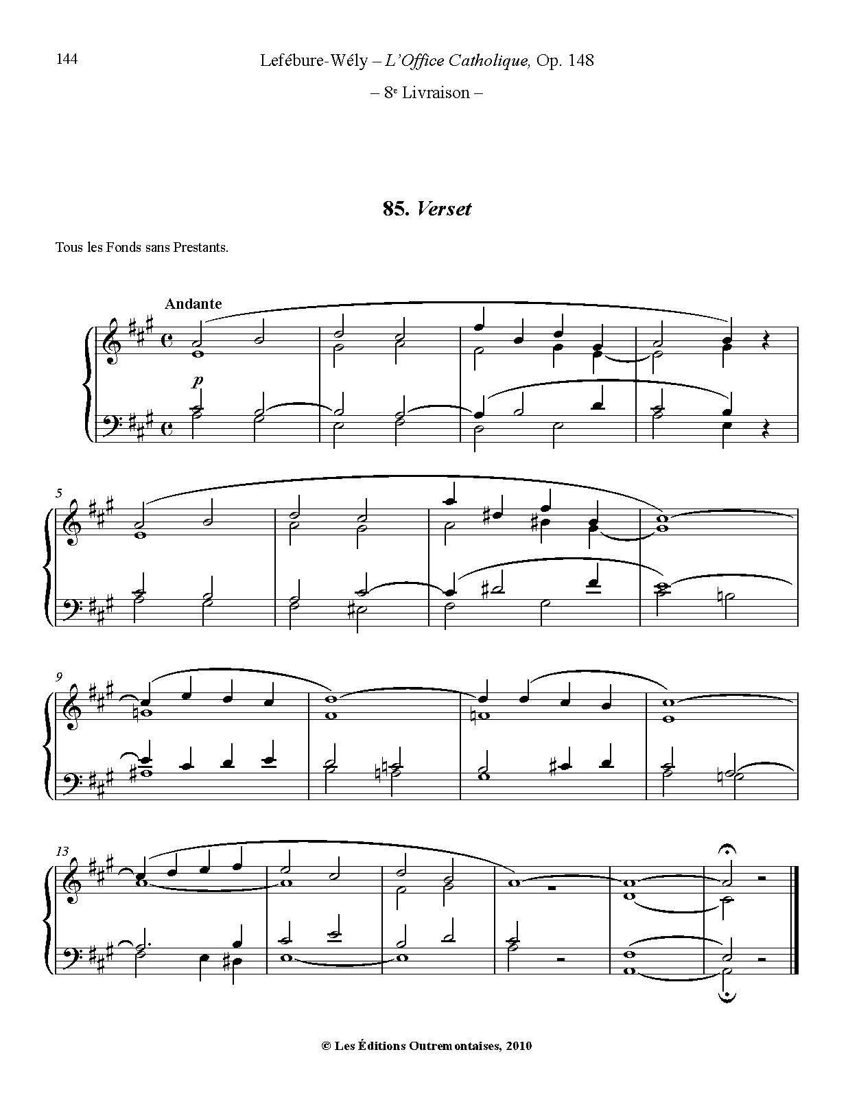 ⇒ 10 more: 86. Verset (A minor) • 87. Communion (C major) • 88. Verset (F major) • 89. Marche (C major) • 90. Élévation (G major) • 91. Verset (C major) • 92. Offertoire (G major) • 93. Communion (F major) - 94. Prélude (D minor) • 95. Sortie (C major) • 96. Verset (A♭ major)