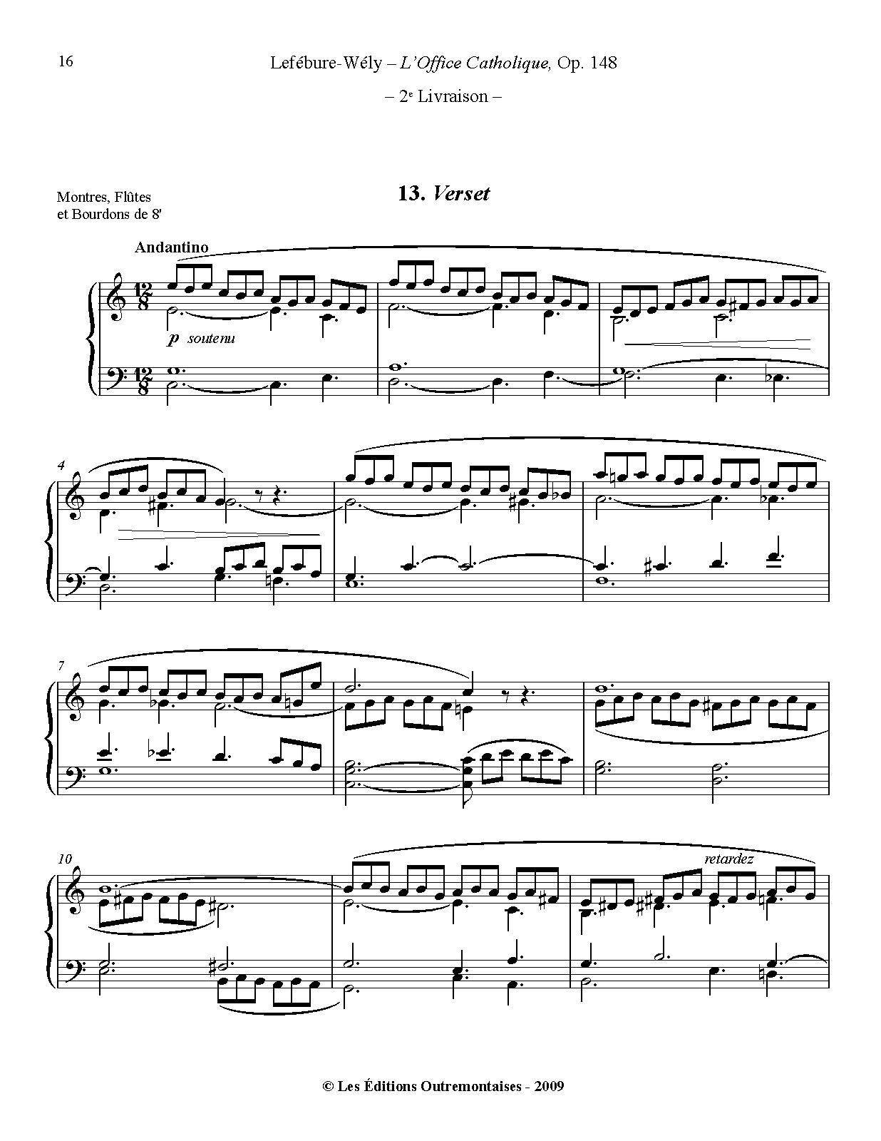 ⇒ 10 more: 3. Verset (D major) • 4. Verset (G major) • 5. Élévation ou Communion (C major) • 6. Verset (E♭ major) • 7. Verset (B♭ major) • 8. Verset (G minor) • 9. Verset (D major) • 10. Verset (G major) • 11. Verset (E minor) • 12. Marche pour Procession ou Sortie de Chœur (C major)