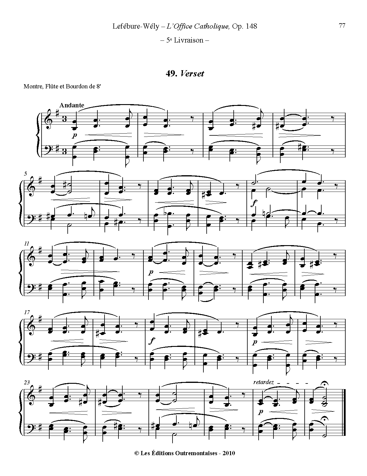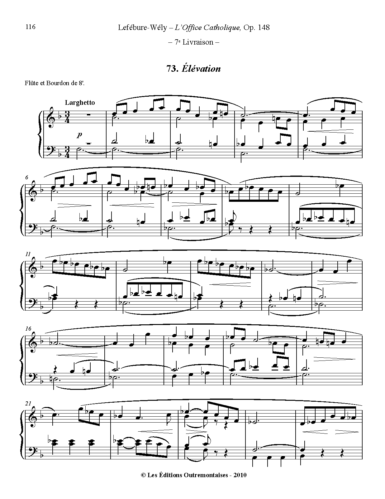 ⇒ 10 more: 62. Grand Chœur pour un verset final (G major) • 63. Élévation (E major) - 64. Verset (E♭ major) • 65. Verset (D minor) • 66. Offertoire (F major) • 67. Communion (C major) • 68. Marche (F major) • 69. Verset (A major) • 70. Verset (F major) • 71. Verset (D major) • 72. Sortie (C major)