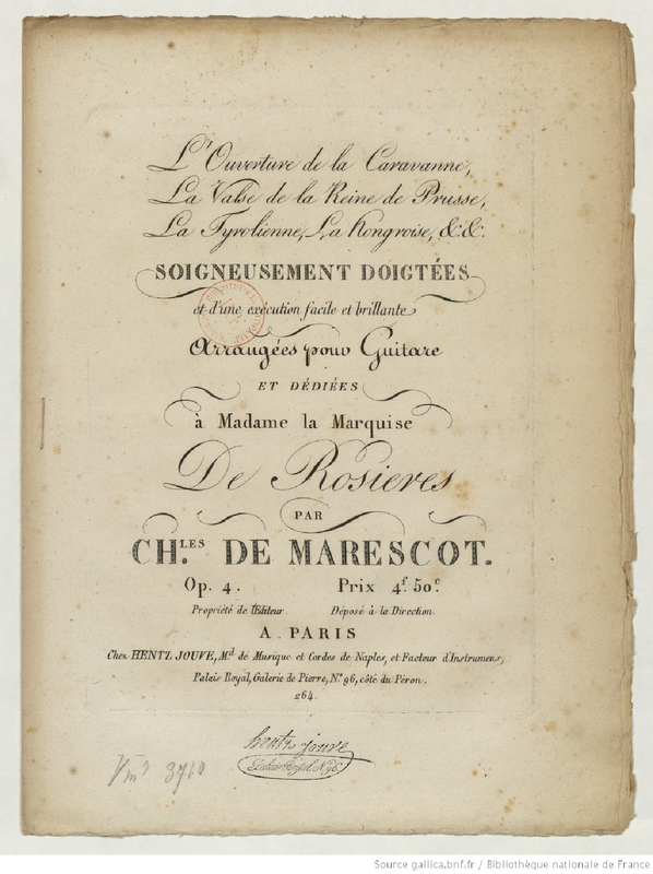 | Alternative. Title | L'Ouverture de la Caravanne, la Valse de la Reine de Prusse, la Tyrolienne, la Hongroise, etc, soigneusement doigtées et d'une éxécution facile et brillante arrangées pour Guitare |