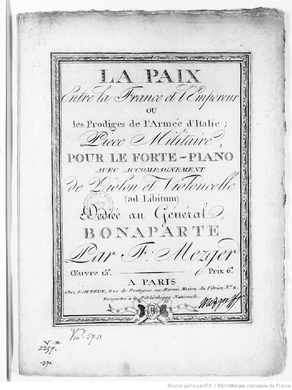 La Paix entre la France et l'Empereur ou les Prodiges de l'Armee d'Italie; Piece Militaire, pour le forte-Piano avec accompagnement de Violon et Violoncelle (ad Libitum)
