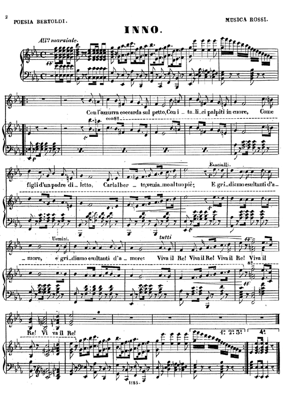 | Extra Information | Popolarissimo, conosciuto anche come “Marsigliese dei Piemontesi”, questo inno fu pubblicato per la prima volta, col titolo “Le riforme”, il 30 ottobre 1847; il giorno prima Carlo Alberto annunciava in Consiglio dei Ministri riforme giudiziarie, amministrative, di polizia e di sanità; la notizia apparve il giorno 30 sulla “Gazzetta piemontese”. Autore dei versi era Giuseppe Bertoldi (1821-1904), di Fubine nel Monferrato. La musica, su commissione dello stesso Carlo Alberto, fu composta a tempo di record da Luigi Felice Rossi; la prima esecuzione, in occasione della partenza del re alla volta di Genova, ebbe luogo in Torino il 3 novembre. |