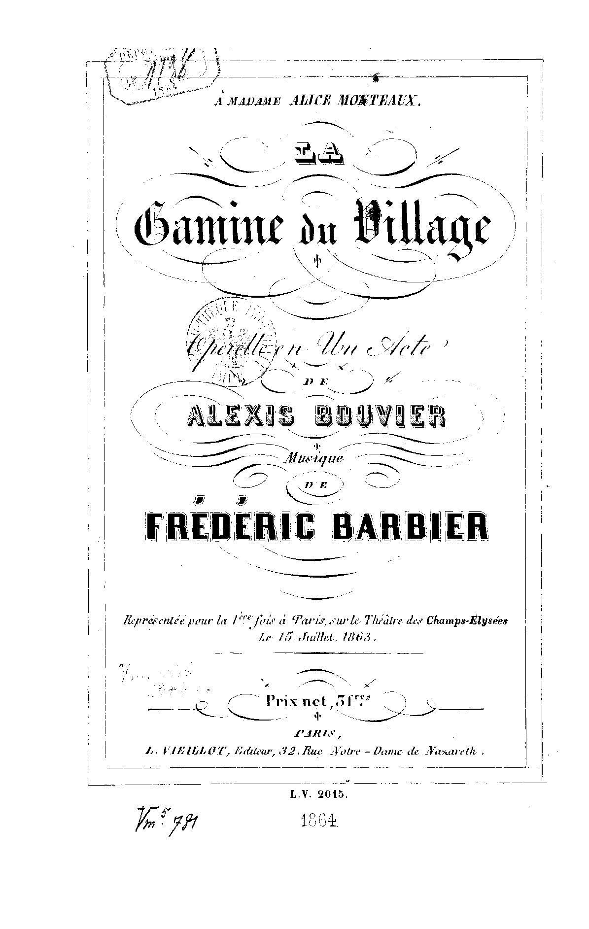 | Copyright Information | Publication noted in the Bibliographie de la France : 53e année, 2e série, Nº 15, 9 Avril 1864, p.174, reg.903 (vocal score). |