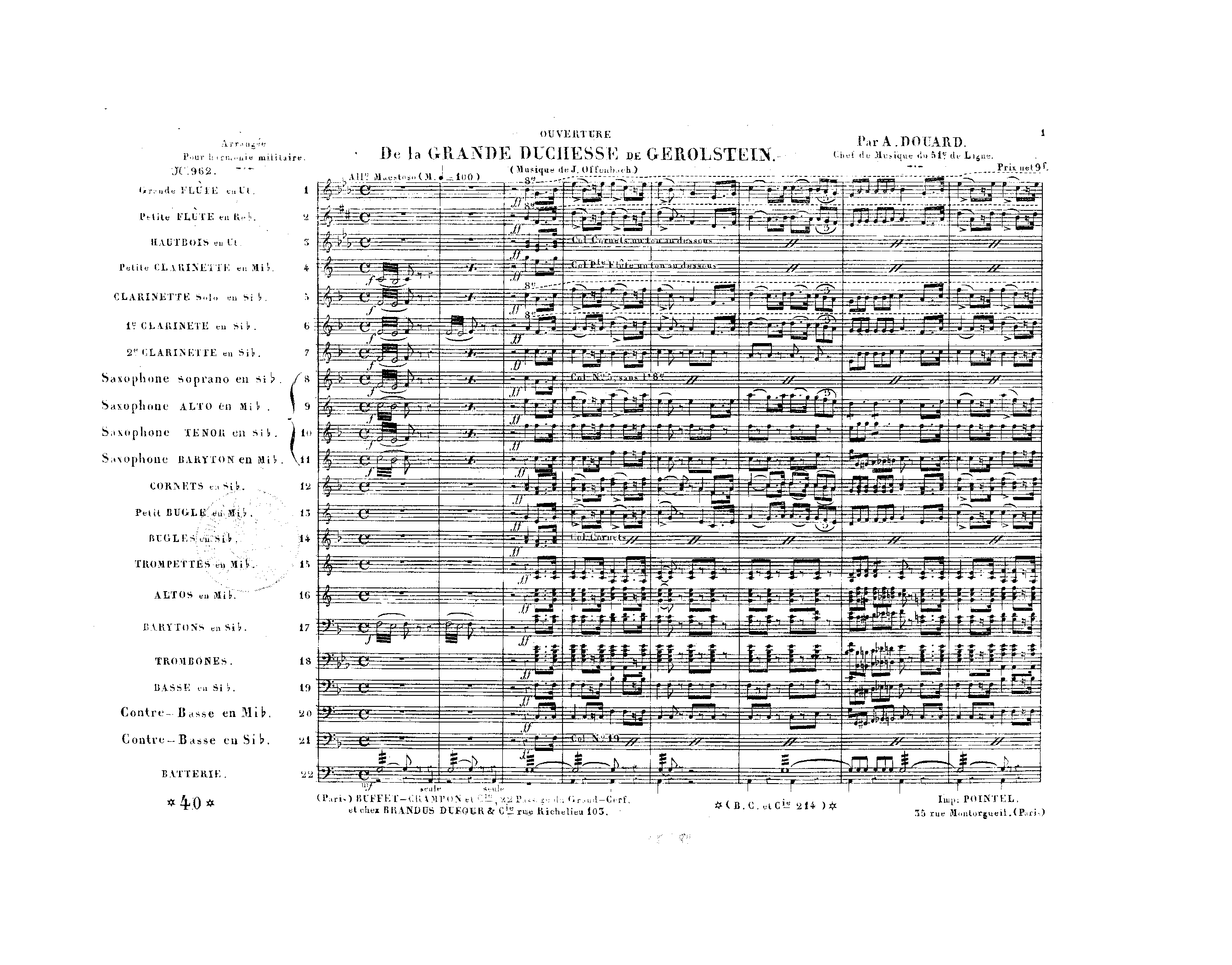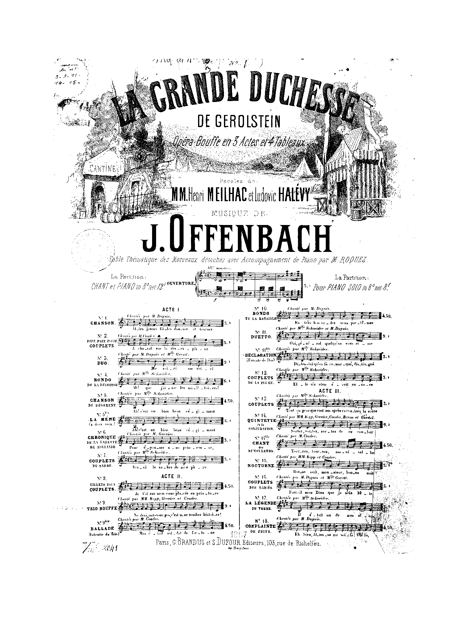 ⇒ 15 more: No.2, Couplets: "Piff, paff, pouff" (Act I, No.1c) • No.4, Rondo de la Duchesse: "Ah! que j'aime les militaires" (Act I, No.3b) • No.5, Chanson du régiment: "Ah! c'est un fameux régiment" (Act I, No.4) • No.6, Chronique de la gazette de Hollande: "Pour épouser une princesse" (Act I, No.5) • No.7, Couplets du sabre: "Voice le sabre de mon père" (Act I, No.6b) • No.8, Couplets des lettres: "Je t'ai sur mon cœur" (Act II, No.8b) • No.9bis, Ballade (extraite de trio): "Ne devinez-vous pas" (Act II, No.11b) • No.10, Rondo de la bataille: "En très-bon ordre nous partiîmes" (Act II, No.9b) • No.11bis, Déclaration: "Dites-lui qu'on l'a remarqué" (Act II, No.10b), E major • No.11ter, Déclaration: "Dites-lui qu'on l'a remarqué" (Act II, No.10b), G major • No.12, Couplets de la plume: "Elle n'a rien écrit encore" (Act II, Finale) • No.13, Couplets: "O grandes leçons du passé" (Act III, No.14) • No.16, Couplets des mariés: "Faut-il mon Dieu" (Act III, No.18a) • No.17, La légende du verre: "Il était un de mes aieux" (Act III, No.20b) • No.18, Complainte de Fritz: "Eh bien, Altesse, me voilà" (Act III, No.21b)