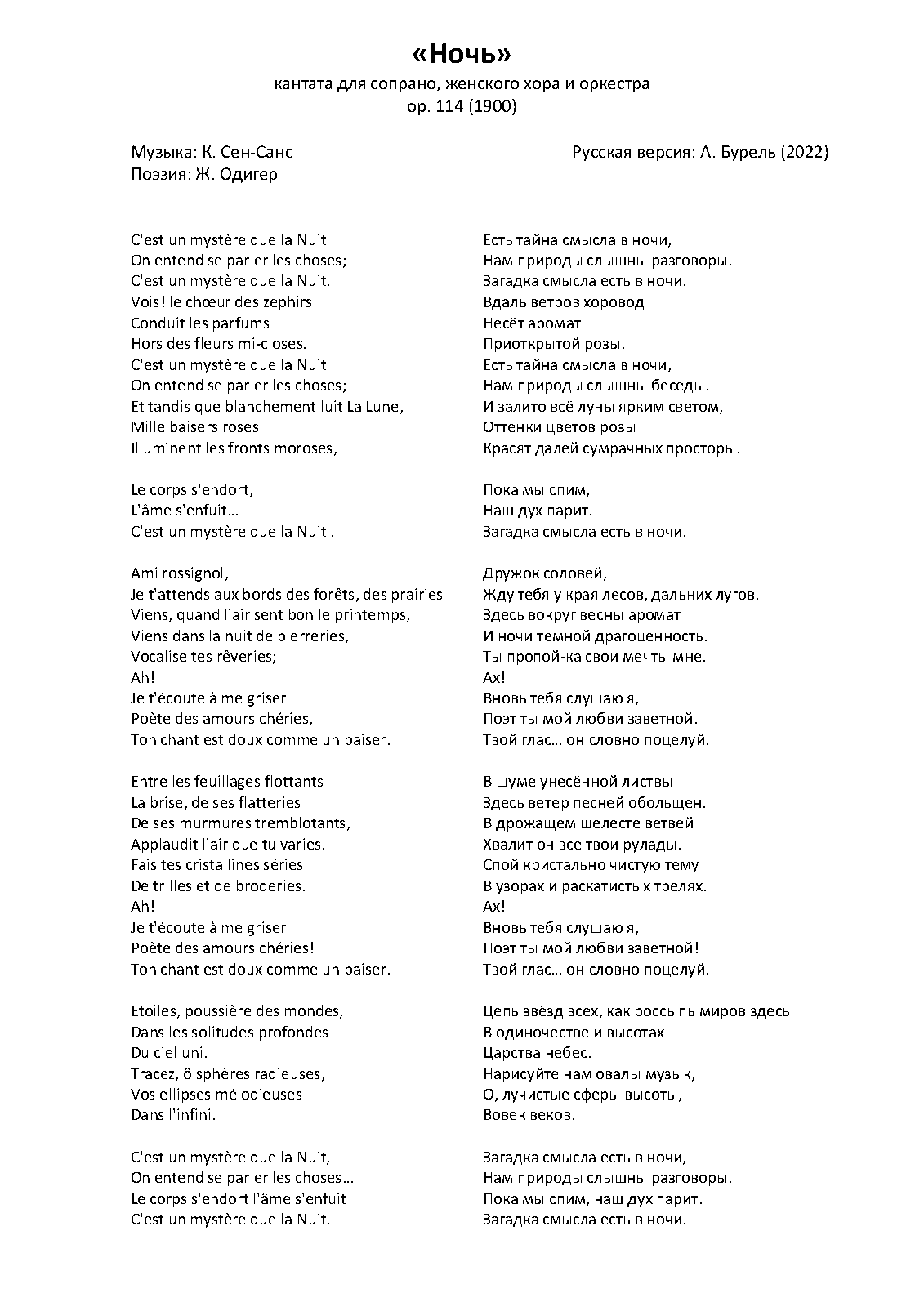 Soprano, women's chorus (SSAA) and Orchestra (2 flutes, 2 oboes, 2 clarinets, 2 bassoons, 4 horns, harp, strings)