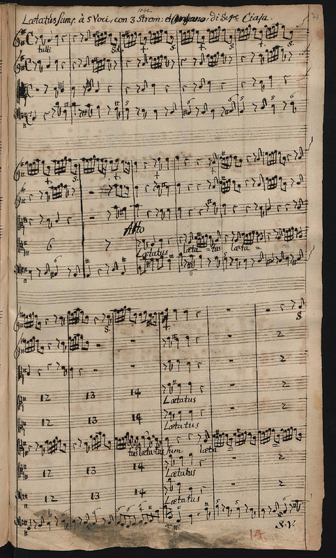 2 sopranos, alto, tenor, bass; mixed chorus (SSATB), 2 violins (possibly doubled by 2 oboes), viola, continuo