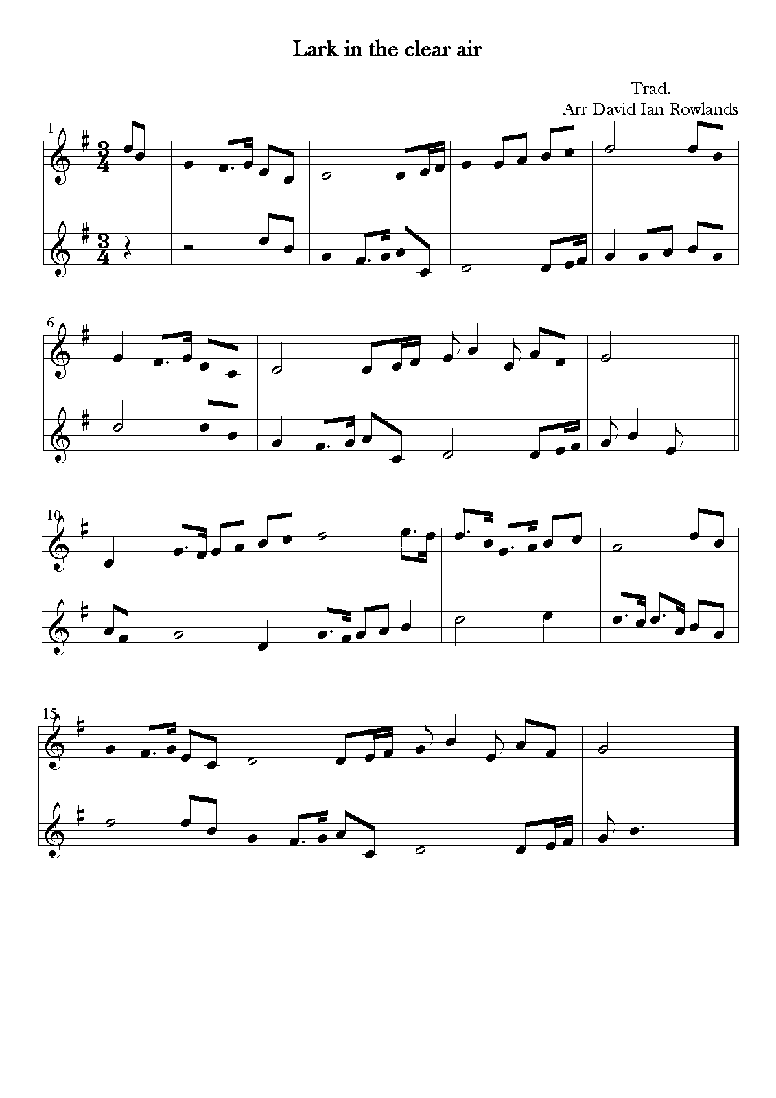 | Extra Information | My arrangement. From Petrie's 'Complete Collection of Irish Music', Boosey & Co, London 1903/1905. This is the tune 'The Taylor', to which Samuel Ferguson wrote 'The Lark in the Clear Air' in the mid C19th |
