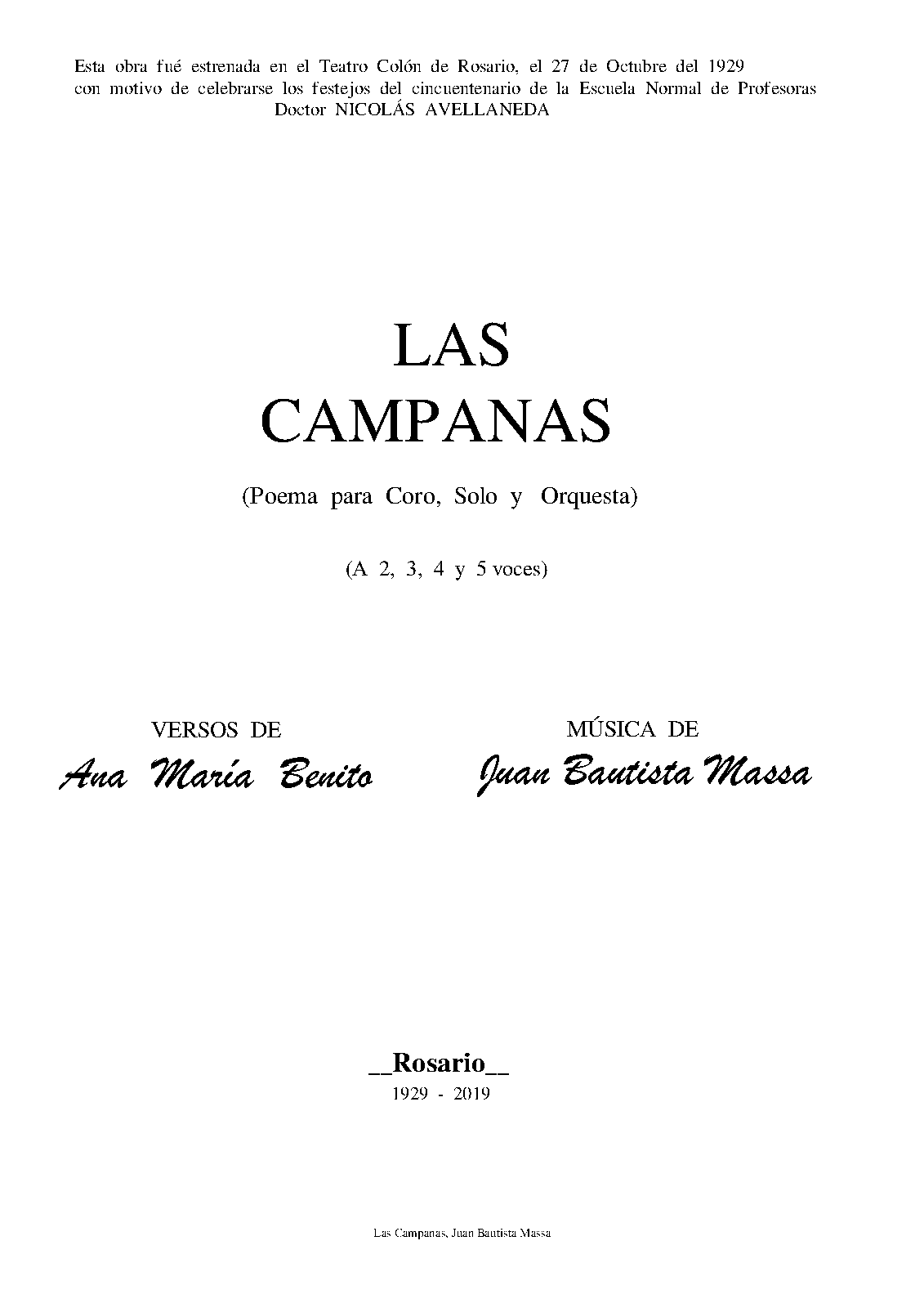 Esta obra fue estrenada en el Teatro Colón de Rosario, el 27 de octubre de 1929 con motivo de celebrarse los festejos del cincuentenario de la Escuela Normal de Profesoras Doctor NICOLAS AVELLANEDA