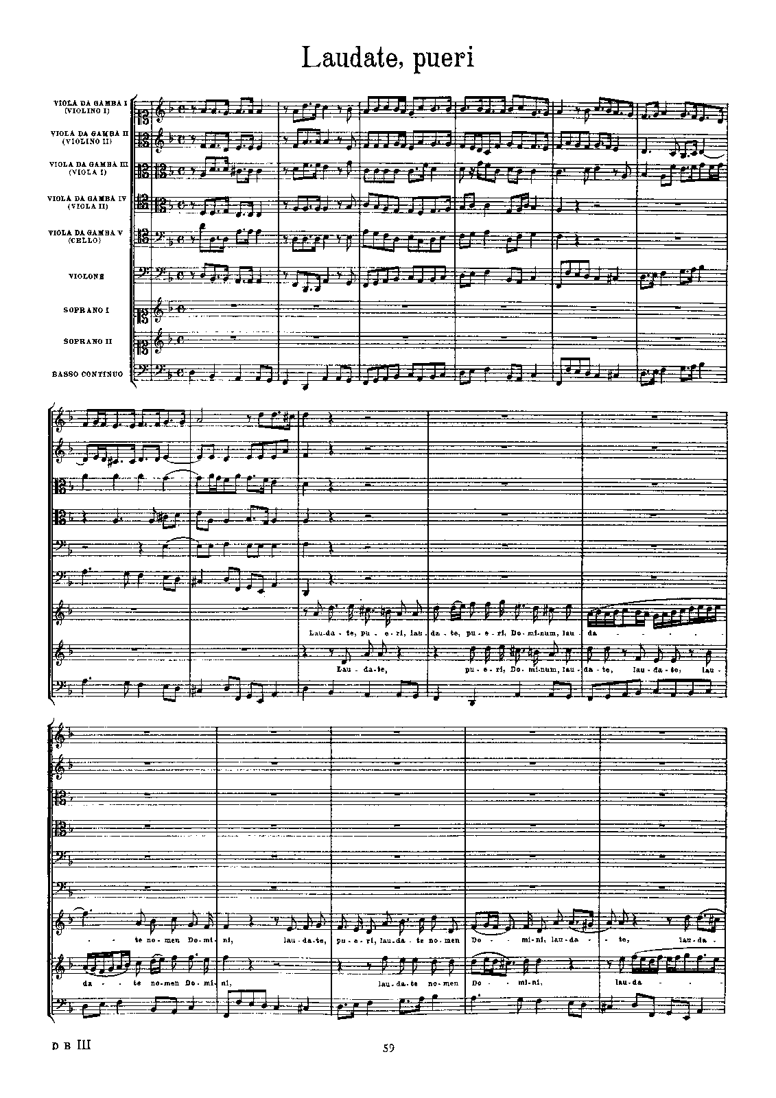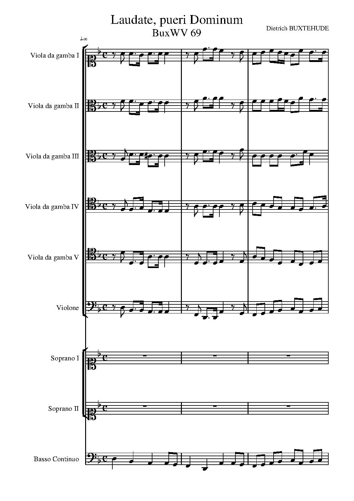 | Instrumentation | 2 sopranos, 5 viols (TrTrATB) (or 2 violins, 2 violas, cello), violone, continuo |