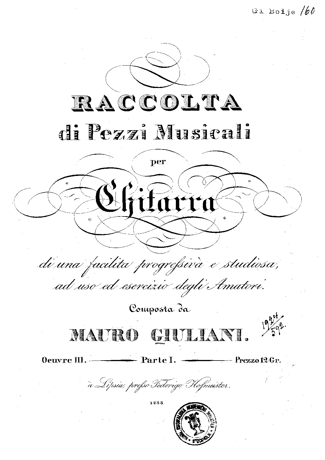 | Alternative. Title | Opera periodica contenente una raccolta di pezzi musicali per chitarra di una facilità progressiva, e studiosa, ad uso ed esercizio degli amatori |
