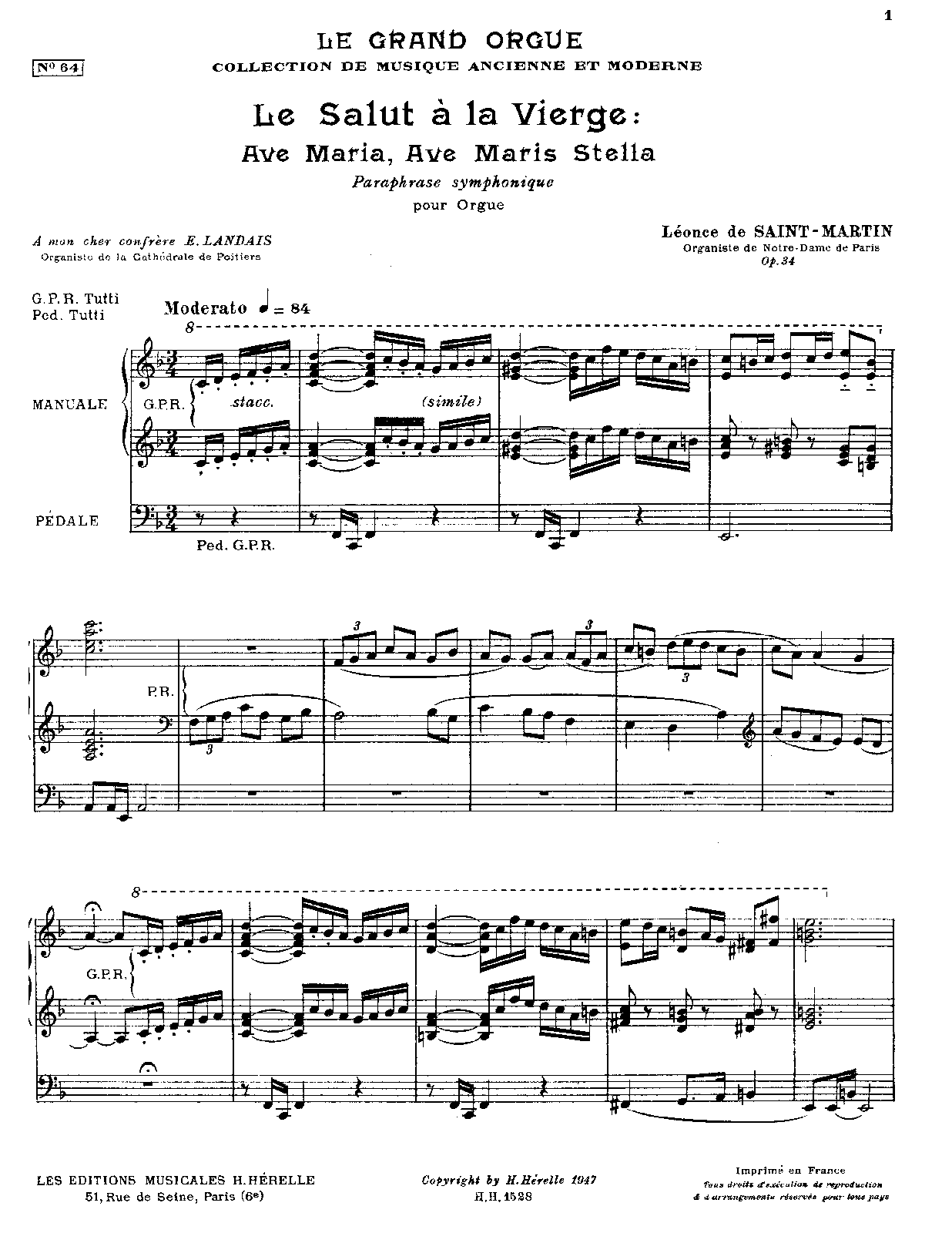 | Work Title | Le Salut à la Vierge: Ave Maria, Ave Maris Stella - Paraphrase Symphonique pour orgue |