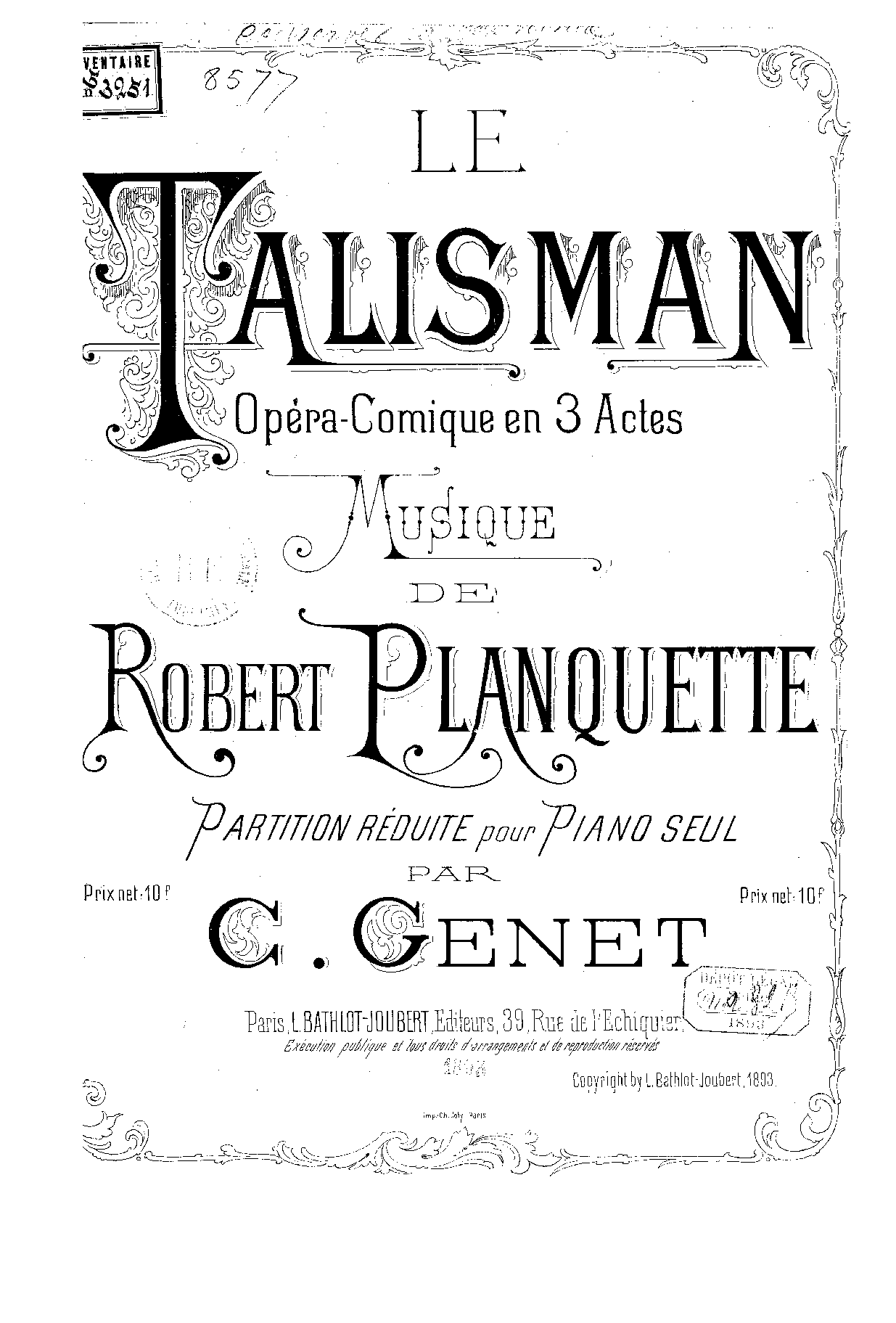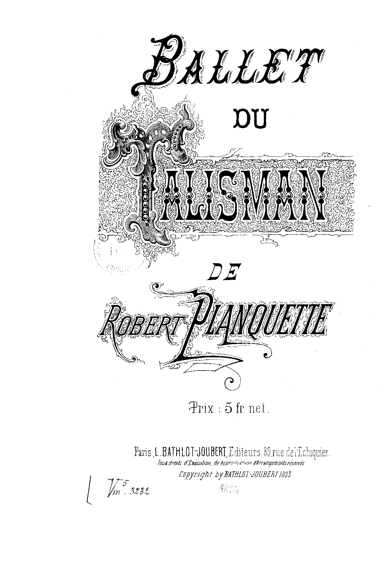 | Copyright Information | Publication noted in the Bibliographie de la France : 82e année, 2e série, Nº 11, 18 Mars 1893, p.186, reg.1341 (vocal score). |