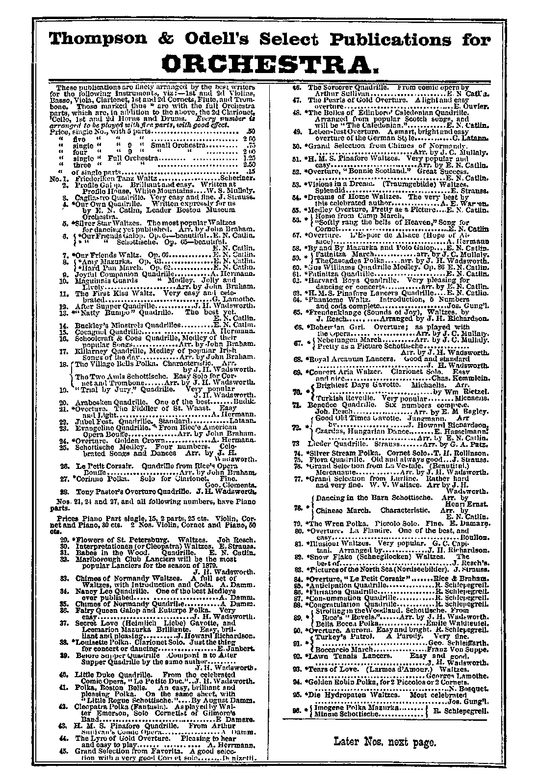 The publisher also made available the following additional parts: cello, second clarinet, first and second horns, and drums (often including triangle).