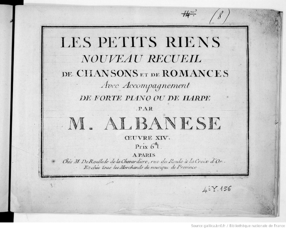 | Alternative. Title | Nouveau recueil de chansons et de romances avec accompagnement de forte-piano ou de harpe. |