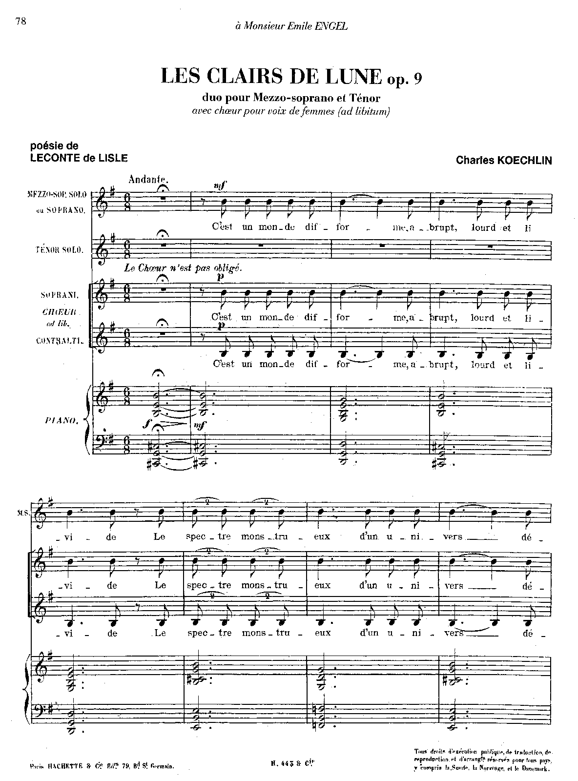 Composed 1893 according to Orledge (mezzo, tenor, optional female chorus) (premiere date also from the same source - Charles Koechlin (1867-1950): His Life and Works, p.331)