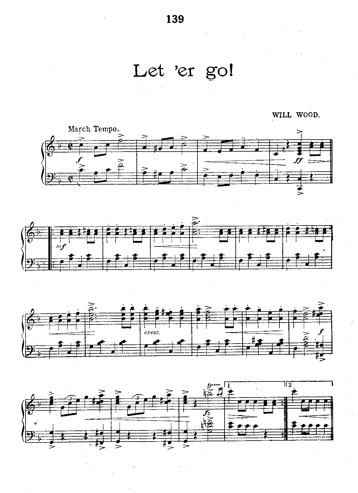 Published as "Let 'er go march" in 1907 by Will Wood Pub. Co., New York. (History of publisher might be useful in finding out more about composer.)