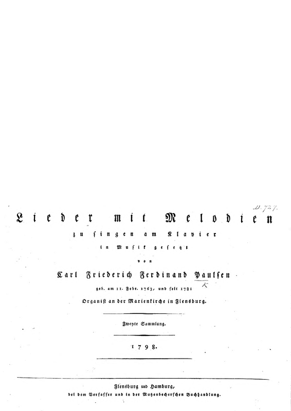 | Alternative. Title | Lieder mit Melodien zu singen am Klavier in Musik gesetzt von Carl Friederich Ferdinand Paulsen geb. am 11. Febr. 1763, und seit 1781 Organist an der Marienkirche in Flensburg |