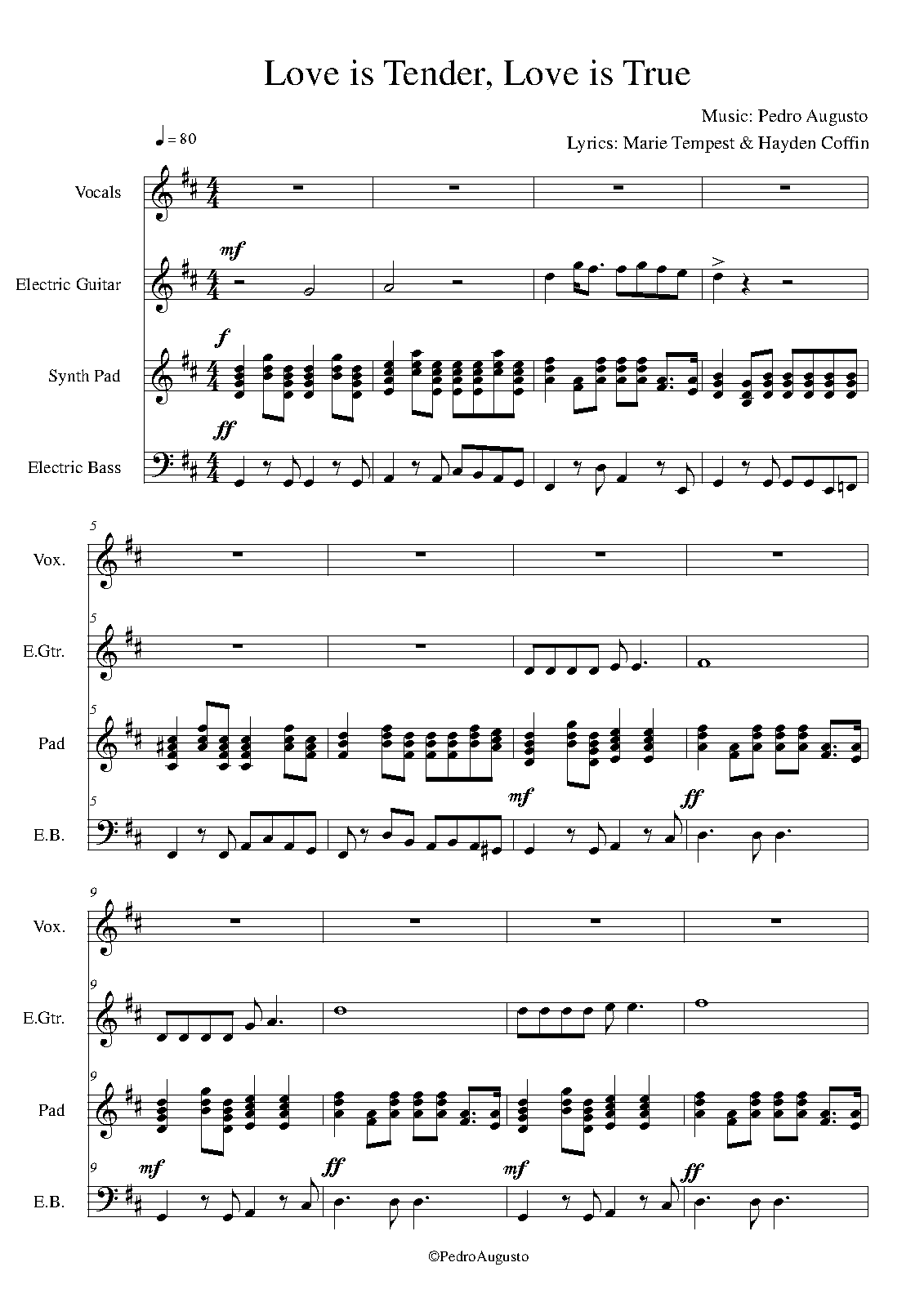 This composition is part of an Album collection that will be first published as a four-volume score music book entitled "Fluxo-inspiration: 35 years of songs" (in portuguese, its published language: "Fluxo-inspiracao: 35 anos de musica") containing the following four volumes: I) Love & Peace (13 compositions); II) Ecology & Fado (12 compositions); III) Rock & Blues (13 compositions); IV) Instrumentals (13 compositions). "Love is tender, love is true" was the first composition ever of the author, in 1986. Hence the honour to open up the Album collection as "The First" ("A Primeira"), the only composition on part 1 of volume I.