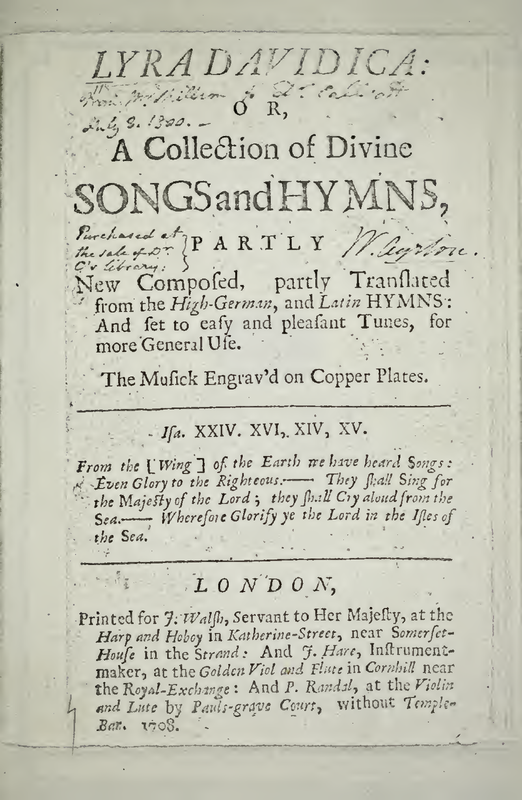 Lyra Davidica: Or, A Collection of Divine Songs and Hymns : Partly New Composed, partly Translated from the High-German, and Latin Hymns: And set to easy and pleasant Tunes, for more General Use ; The Musick Engrav'd on Copper plates.