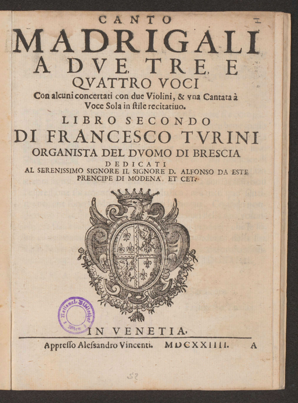 - Vezzose aurette. Gagliarda à 5 (2 sopranos, 3 instruments: [soprano, tenor, bass], continuo)