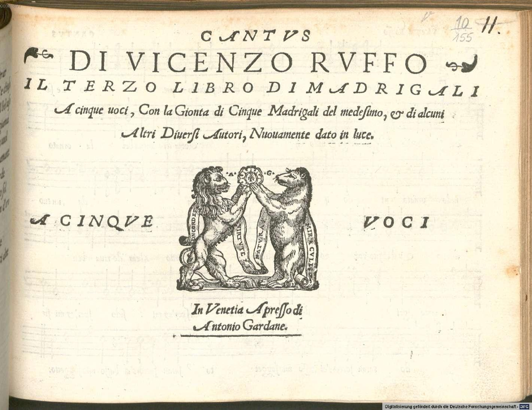 A majority of pieces are by Ruffo, but it also includes 4 madrigals by Ferro, 2 by Rosselli, and one each from Arcadelt, Andrea Gabrieli, and Pionnier.