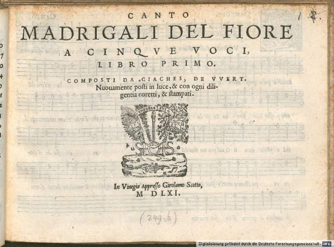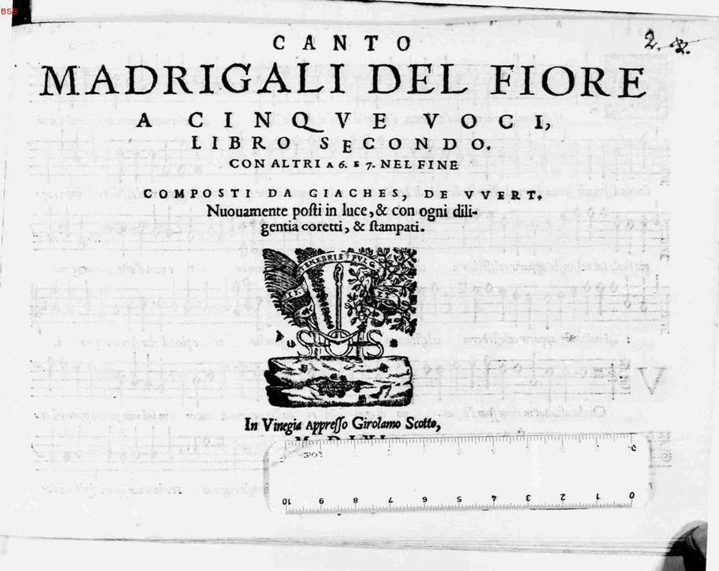 | Alternative. Title | Madrigali del fiore a cinque voci, libro secondo. con altri a 6. e 7. Nel fine composti da Giaches, de Yvert, Nuouamente posti in luce, & con ogni diligentia coretti, & stampati. |