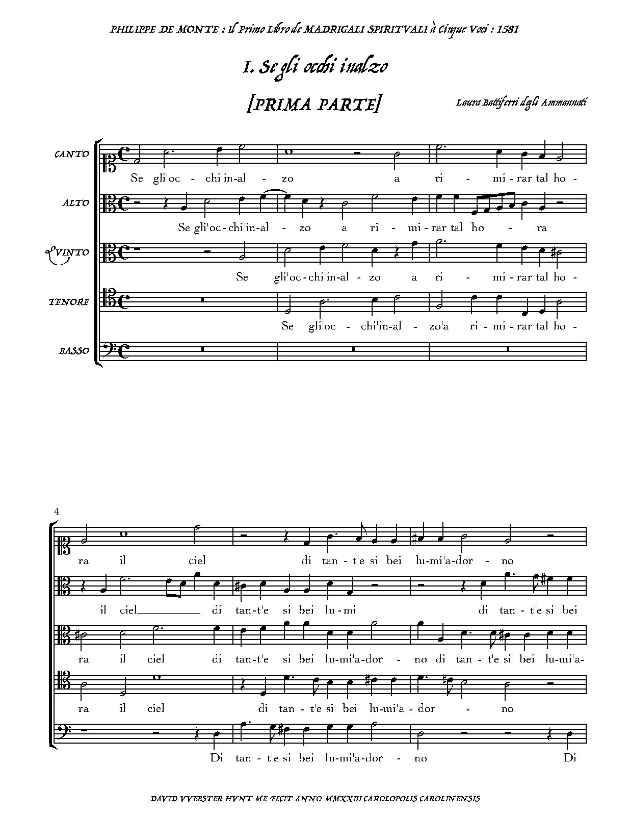 ⇒ 29 more: II. Oh come son di voi (Seconda Parte) • III. L'alto consiglio alhor (Prima Parte) • IV. Perche non la lego (Seconda Parte) • V. Mentre io sciolto correa (Prima Parte) • VI. Ma lettre in ghiaccio (Seconda Parte) • VII. Un foco sol la Donna (Prima Parte) • VIII. Cangiar obietto (Seconda Parte) • IX. Signor chi n'esporra (Prima Parte) • X. O pur perche debbiam (Seconda Parte) • XI. Quando il turbato mar (Prima Parte) • XII. E se talhor la barca (Seconda Parte) • XIII. Su l'alte eterne ruote (Prima Parte) • XIV. L'alma sul divin monte (Seconda Parte) • XIX. Puri Innocenti (Prima Parte) • XV. Se'l breve suon (Prima Parte) • XVI. Che fia quando udira (Seconda Parte) • XVII. Fido pensier se intrar (Prima Parte) • XVIII. Non ti smarrir (Seconda Parte) • XX. Voi senza fede (Seconda Parte) • XXI. Vorrei l'orecchia haver (Prima Parte) • XXII. Amor alza le voci (Seconda Parte) • XXIII. Ben che da dotta man (Prima Parte) • XXIV. E se l'istessa man (Seconda Parte) • XXV. Hoggi Signor (Prima Parte) • XXVI. E di cometter poi (Seconda Parte) • XXVII. Hor che non piu di te (Prima Parte) • XXVIII. A te cosi di me (Seconda Parte) • XXIX. Quand'io scorgo (Prima Parte) • XXX. Ma fera incauta son (Seconda Parte)