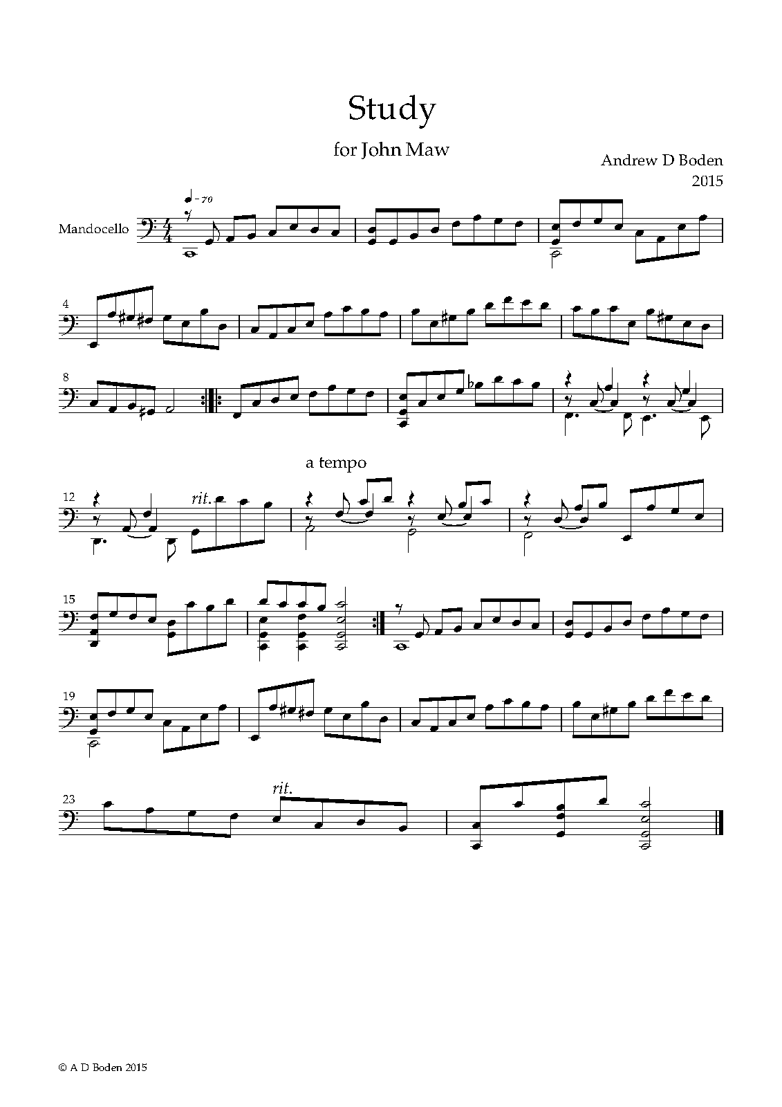 A short study in C major written for John Maw of the London Mandolin Ensemble (and quartet) when he acquired a mandocello