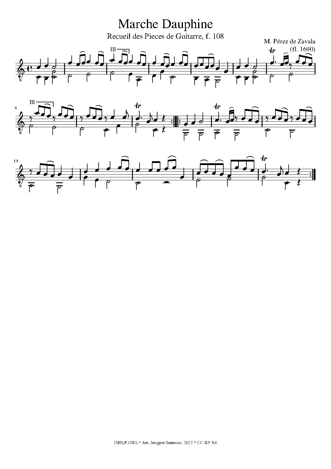 | First Publication | 1730 in François Le Cocq: Recueil des Pieces de Guitarre (f.108) |