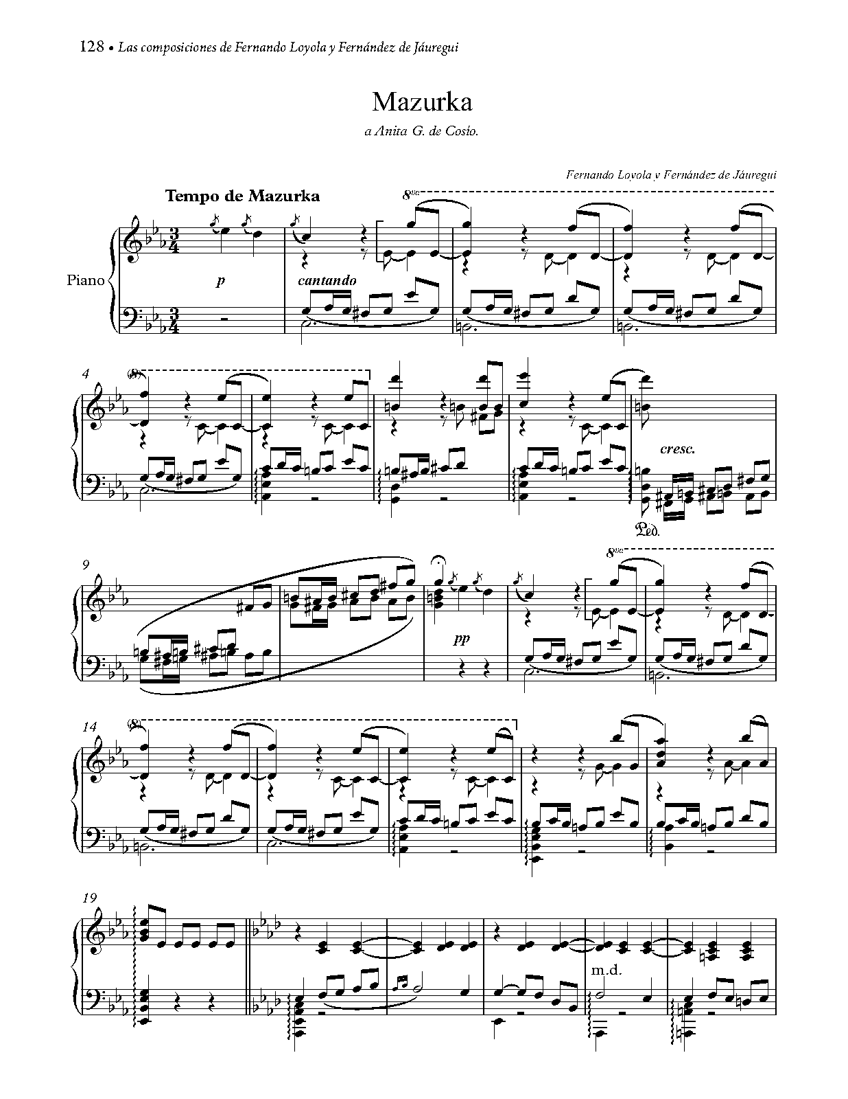 | Extra Information | Escrita en 1903 para Anita G. de Cosío, pianista, hija de Francisco González de Cosío y Araus, gobernador de Querétaro intermitentemente entre 1880 y 1910, por lo que fue conocido como el "Porfirio Díaz queretano" |