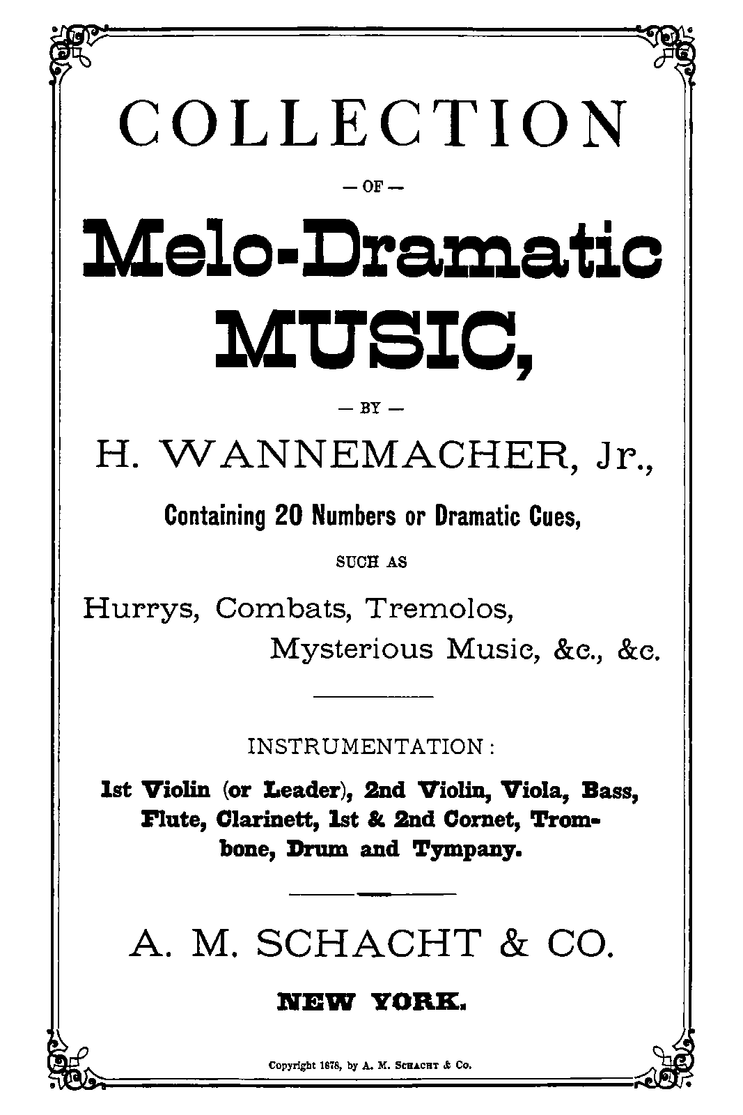 | Alternative. Title | Collection of Melo-Dramatic Music, by H. Wannemacher, Jr., Containing 20 Numbers or Dramatic Cues, such as Hurrys, Combats, Tremolos, Mysterious Music, &c. |