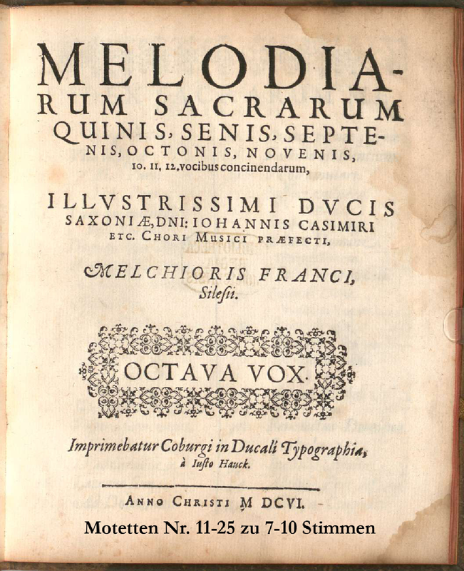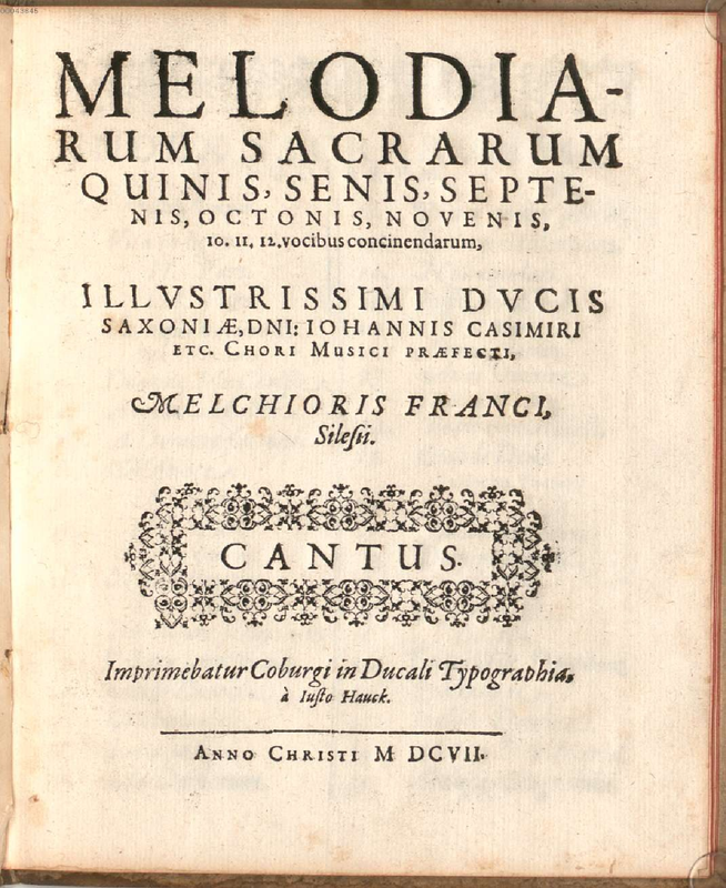 | Alternative. Title | MELODIARUM SACRARUM QUINIS, SENIS, SEPTENIS, OCTONIS, NOVENIS, 10. 11. 12. vocibus concinendarum, ILLVSTRISSIMI DVCIS SAXONIAE, DNI: IOHANNIS CASIMIRI ETC. CHORI MUSICI PRAEFECTI, MELCHIORIS FRANCI, Silesii |