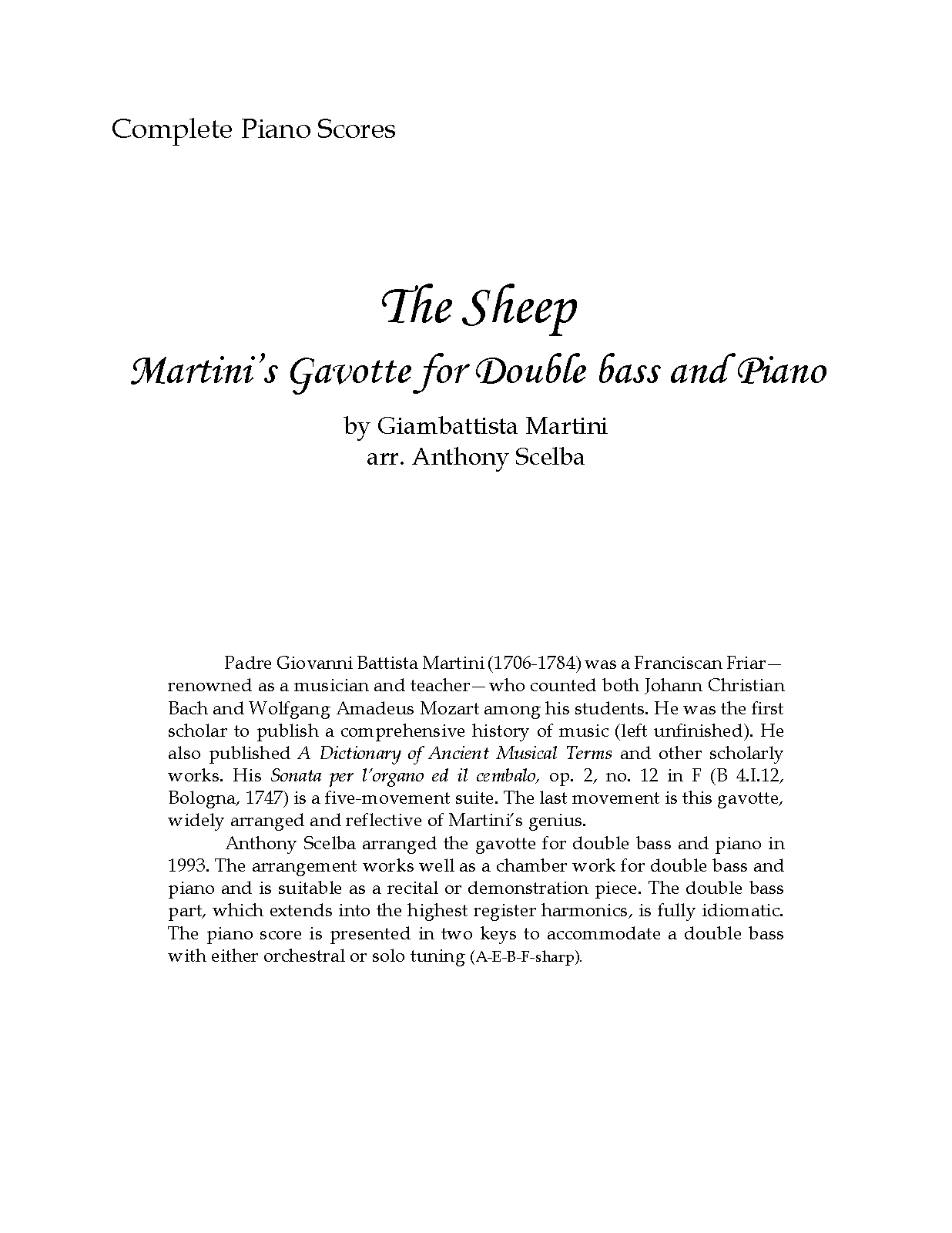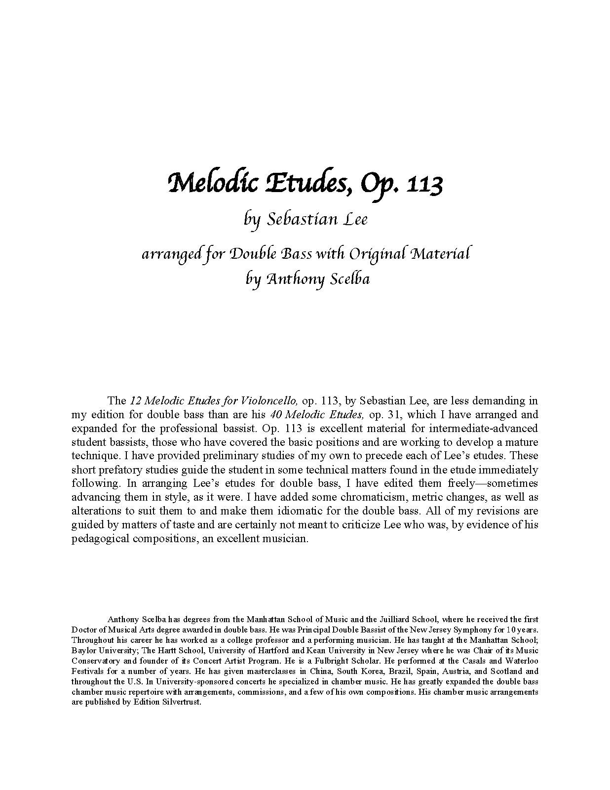 | Extra Information | 12 Melodic Etudes, op. 113, by Sebastian Lee, is less demanding in this edition than are Lee's 40 Melodic Etudes, op. 31 (arranged and expanded by Anthony Scelba for the professional double bassist). Excellent material for intermediate-advanced student bassists is preceded by original, studies. These short prefatory studies guide the student in some technical matters found in the etude immediately following. In arranging Lee’s etudes for double bass, the works are freely altered to suit them to and make them idiomatic for the double bass. |