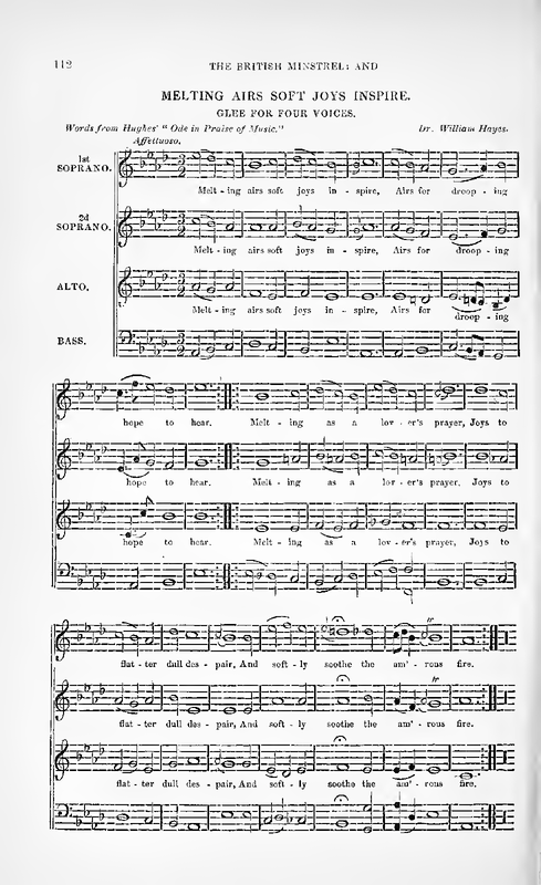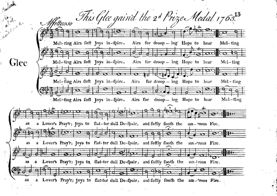 Published in William Hayes's second book of 'Catches, Glees and Canons' (1765). This little work was one of the earliest simple harmonised Glees for unaccompanied voices. It won Second Prize at the Nobleman and Gentlemen's Catch Club in London in 1763.