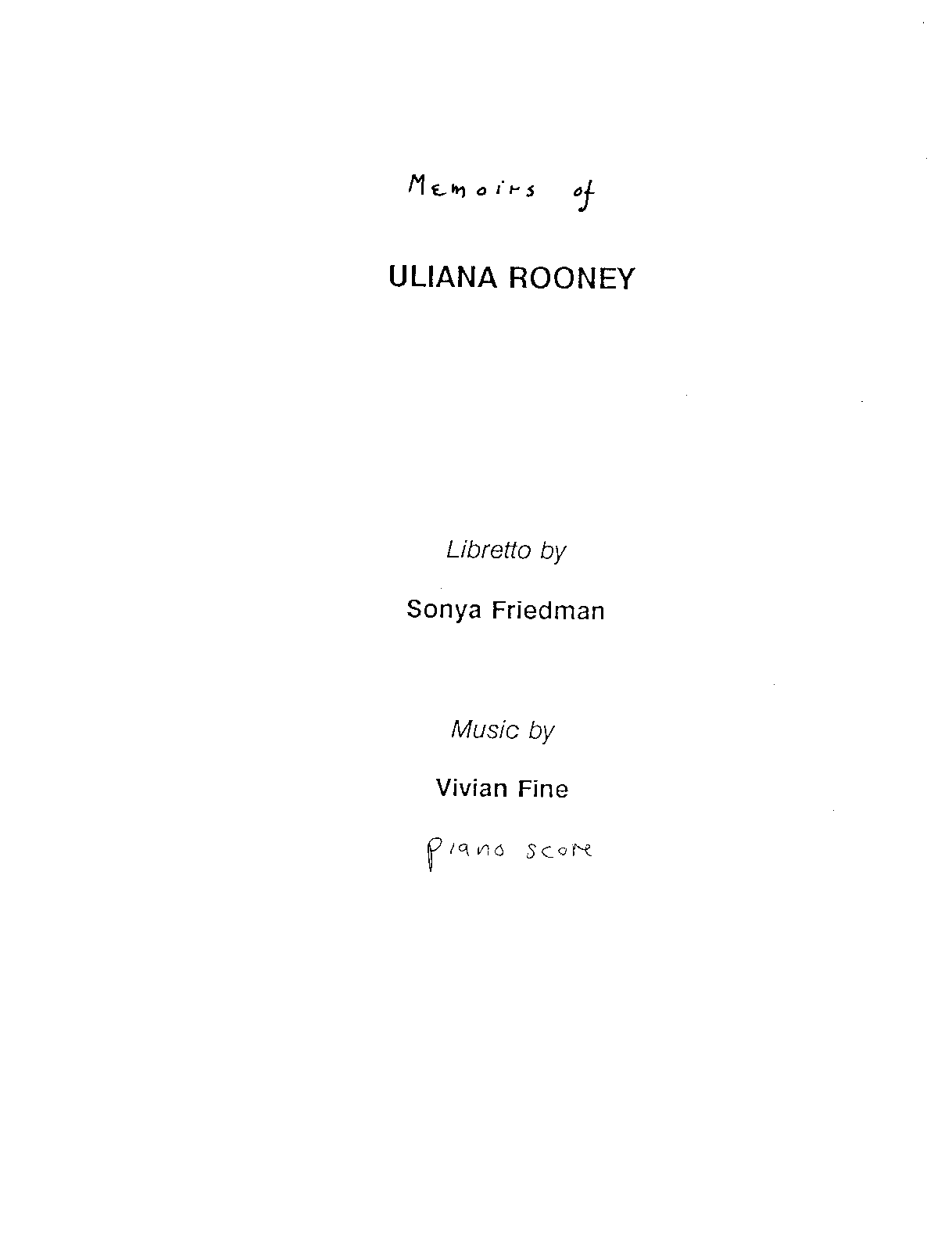 Memoirs of Uliana Rooney portrays the life of Uliana Rooney, a fictional American composer, from the 1920s to the mid-1990s. Archival and original film footage compiled by Emmy-Award winning videographer Sonya Friedman play a crucial part in the stage production and give the audience a vivid experience of the decades through which Uliana lives. Uliana's many husbands act as humorous personifications of their respective eras. Uliana was Vivian Fine’s last major work and her musical memoir–autobiographical in spirit if not in factual detail. The witty score includes musical quotes from herself as well as Bach, Copland, Schoenberg, Kurt Weill, and Alma Mahler. The opera requires only modest performance resources and is well suited to small music theater groups.