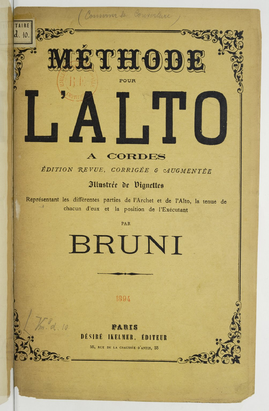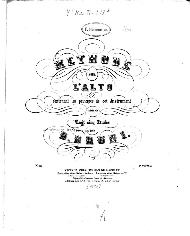 Title: Methode pour l'Alto contenant les principes de cet instrument, suivis de vingt cinq Etudes Uses old plate number, although edition is entirely re-engraved. Dated between 1865-1885 based on the Brussels and London addresses given on title-page.