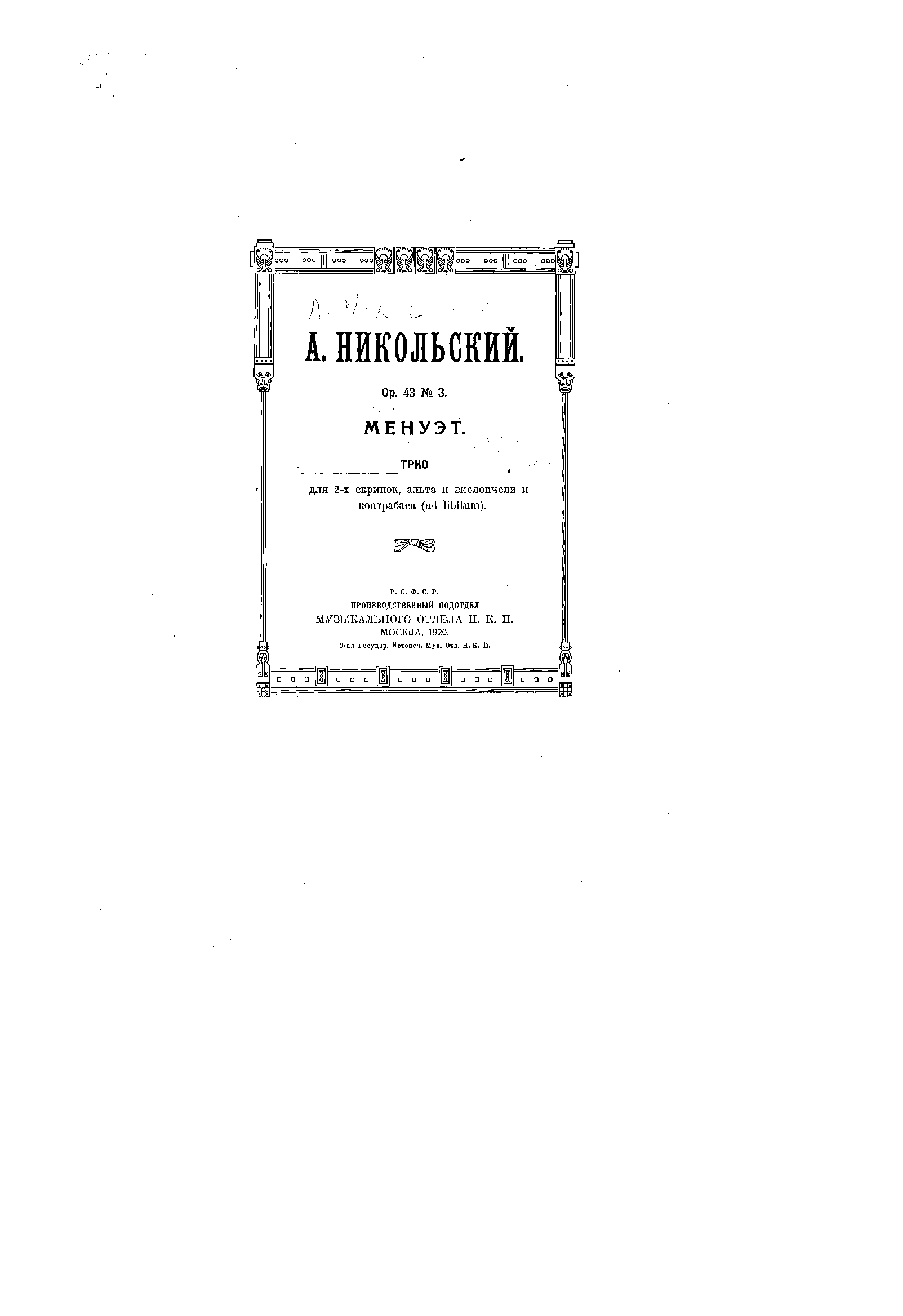 Publisher. Info. Moscow: Muzykalʹnogo otdela N.K.P., 1920. Plate 814.