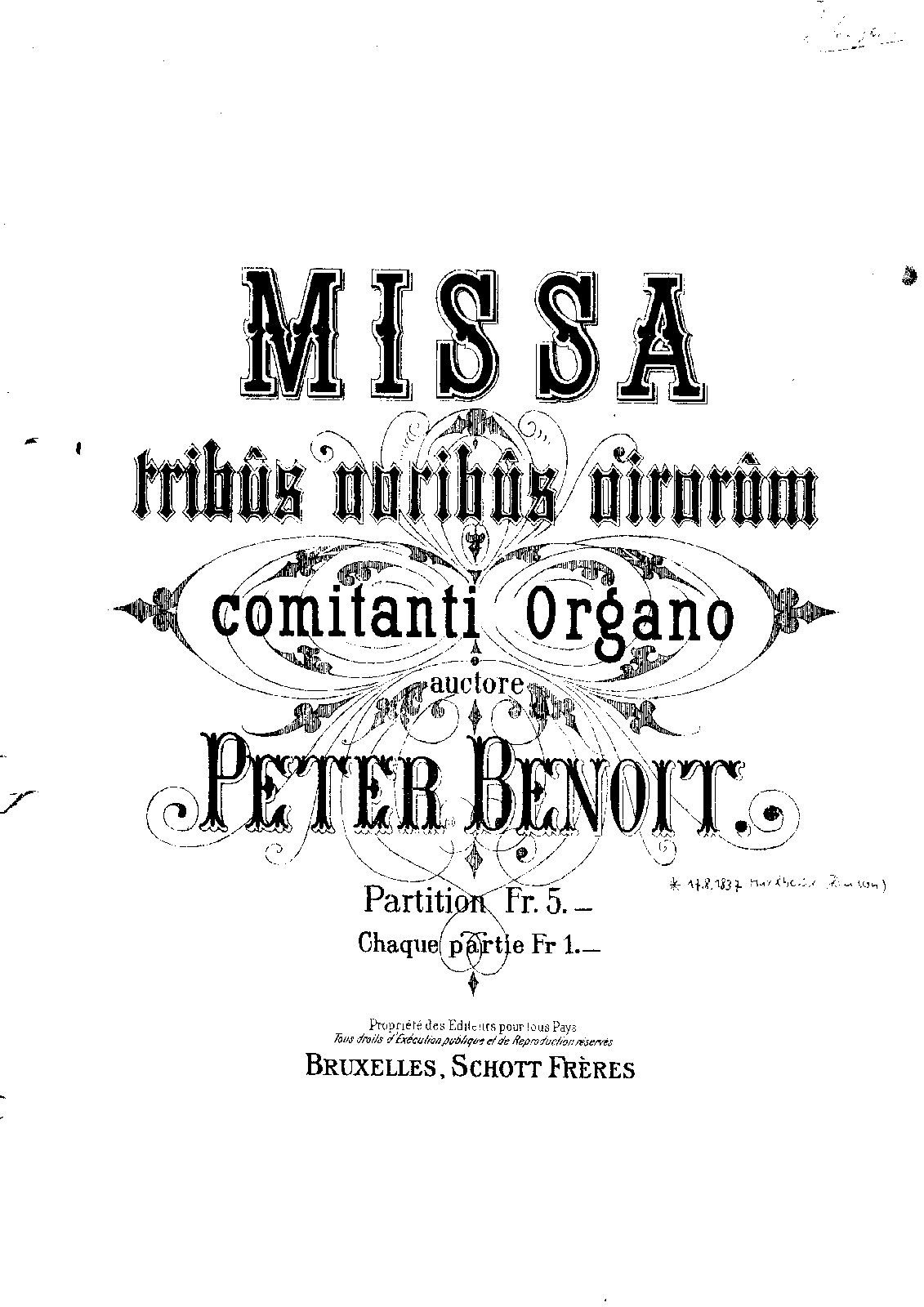 There is also another D minor mass by Benoit, composed in 1860, a messe "solemnelle"- a different and rather larger piece of work (see RISM 701000534. The 1860 work is probably the "Hoogmis" - which means the same thing - that's been recorded once or twice).