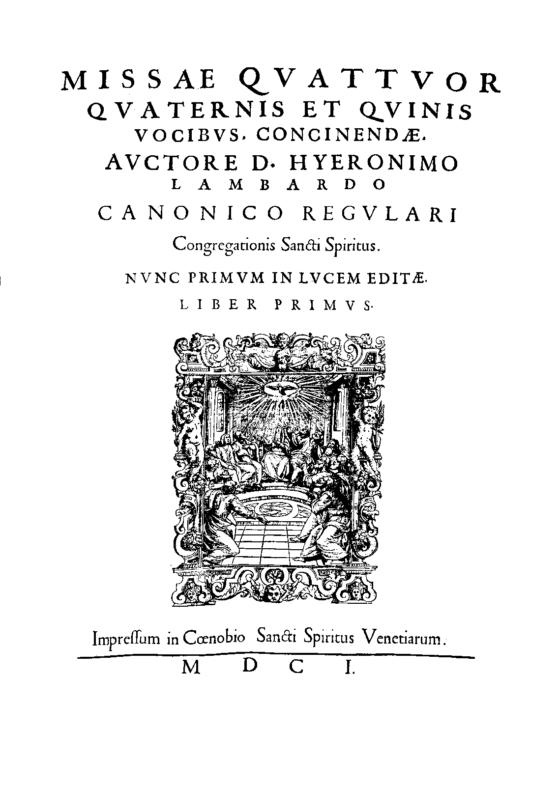 - MISSAE QVATTVOR / QVATERNIS ET QVINIS / VOCIBVS, CONCINENDÆ. / AVCTORE D. HYERONIMO / LAMBARDO / CANONICO REGVLARI / Congregationis Sanĉti Spiritus. / NVNC PRIMVM IN LVCEM EDITÆ. / LIBER PRIMVS.</span>