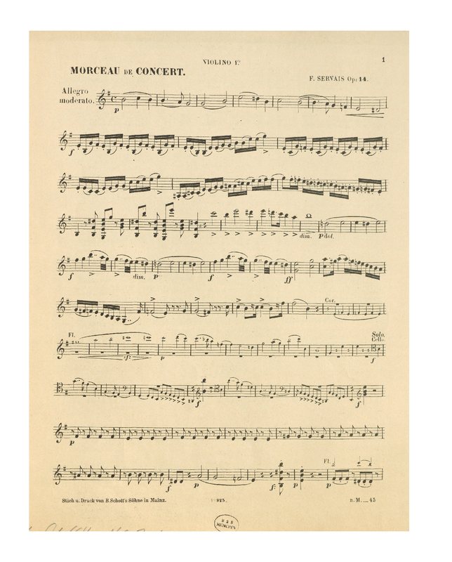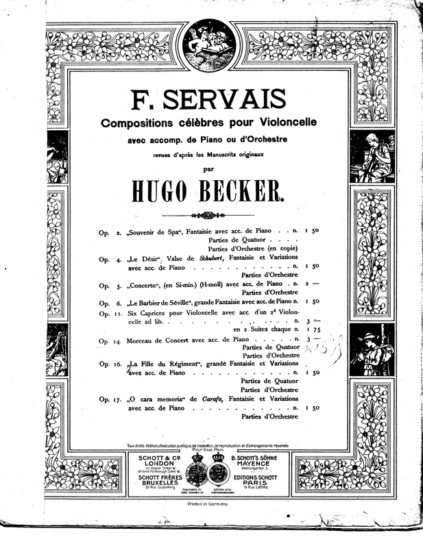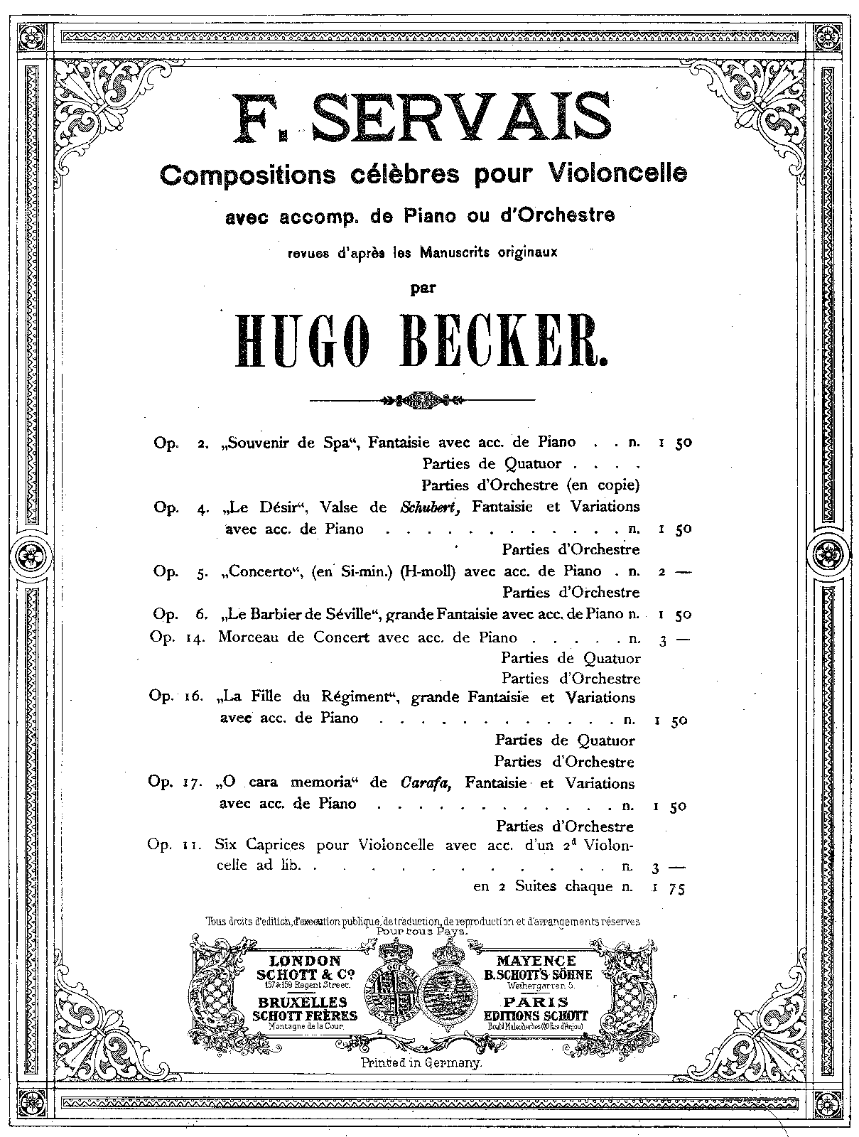 Sometimes called his 2nd cello concerto (as on a 2012 recording of Servais' "2 cello concertos" and other works which contains opp.5, 9, 14, and "La romanesca".). According to the notes of that recording, there is a manuscript in the Royal Brussels Conservatory that allows dating of this concerto to the 1830s and which corresponds "in large measure" to the first, 1853/4 printed version. This work was used as an examination piece (Morceaux de concours) by the Conservatoire de Paris. The Conservatoire used this work in the following year(s): 1880, 1885, 1887, 1893.