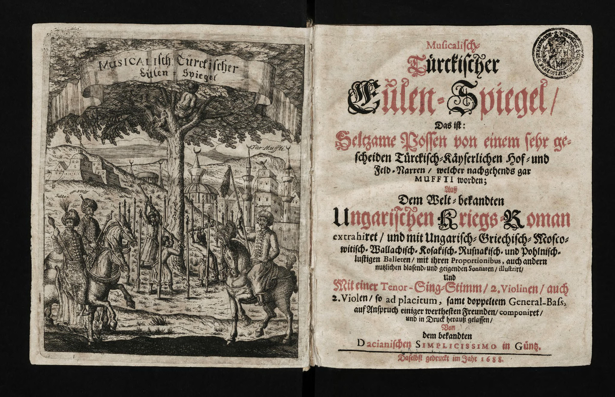 Musikalisch-Türkischer Eulen-Spiegel, das ist: seltzame Possen von einem sehr gescheiden Türkisch-Käyserlichen Hof- und Feld-Narren, welcher nachgehends gar Muffti worden; auß dem Welt-bekandten Ungarischen Kriegs-Roman extrahiret, und mit Ungarisch- Griechisch- Moscowitisch- Wallachisch- Kosakisch- Rusnakisch- und Pohlnisch- lustigen Balleten, mit ihren Proportionibus, auch andern nutzlichen blasend- und geigenden Sonnaten, illustrirt, und mit einer Tenor-Sing-Stimm, 2. Violinen, auch 2. Violen, so ad placitum, samt doppeltem General-Bass, auf Anspruch einiger werthesten Freunden, componiret, und in Druck herauß gelassen, von dem bekandten Dacianishcen Simplicissimo in Güntz