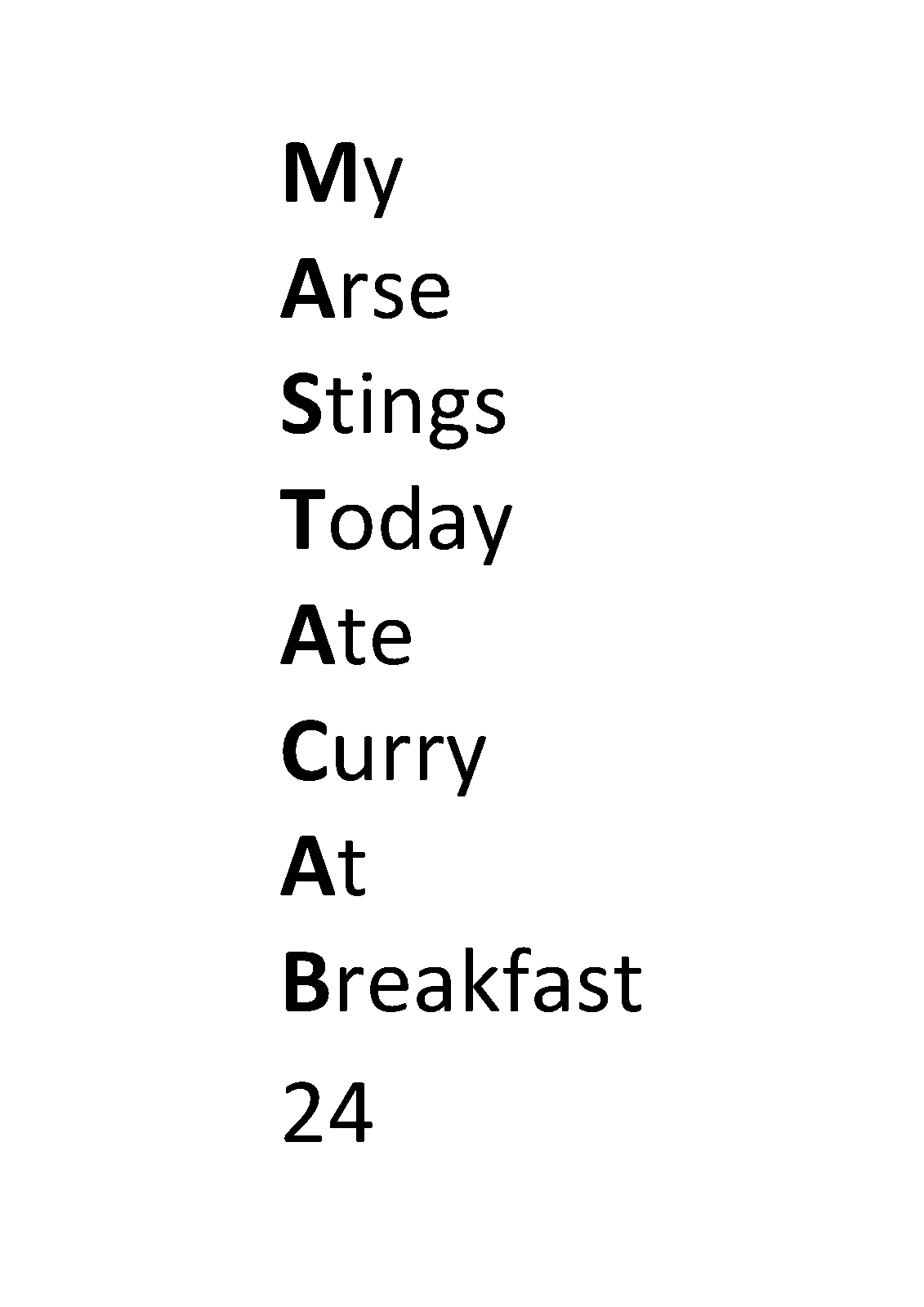 | Work Title | My Arse Stings Today Ate Curry At Breakfast (MASTACAB) 24 |