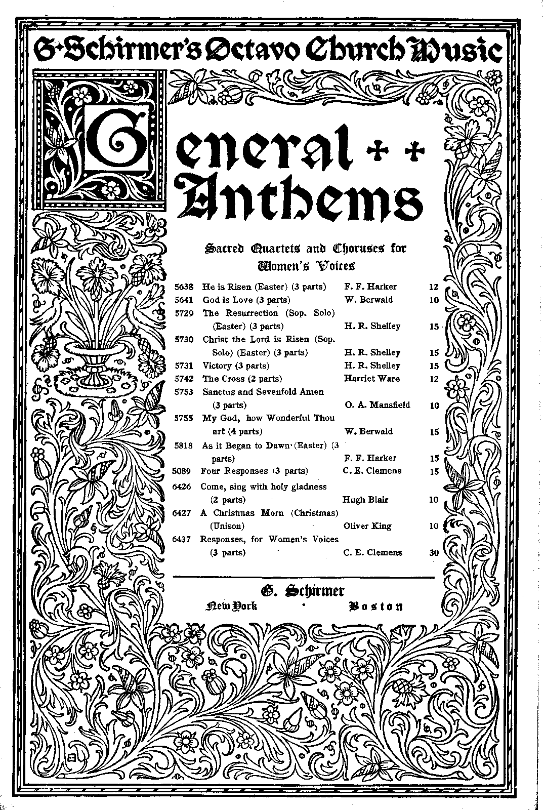 | Genre Categories | Anthems; Religious works; For female chorus, harp, organ; |