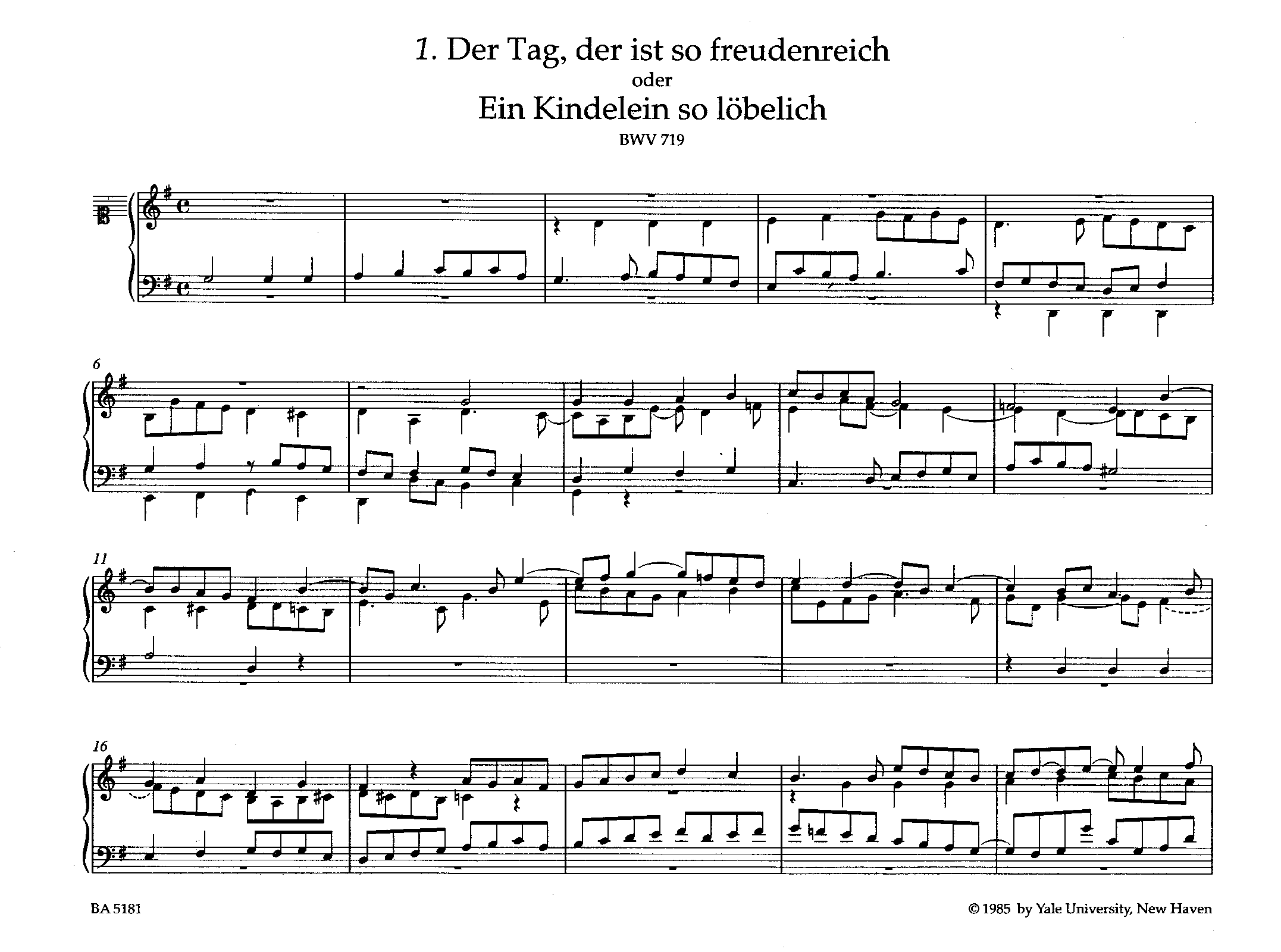 ⇒ 34 more: 1. Der Tag, der ist so freudenreich, BWV 719 • 2. Machs mit mir, Gott, nach deiner Güt, BWV 957 • 3. Wir Christenleut, BWV 1090 • 4. Das alte Jahr vergangen ist, BWV 1091 • 5. Herr Gott, nun schleuß den Himmel auf, BWV 1092 • 6. Herzliebster Jesu, BWV 1093 • 7. O Jesu, ist dein Gestalt, BWV 1094 • 8. O Lamm Gottes unschuldig, BWV 1095 • 9. Christe, der du bist Tag und Licht, BWV 1096 • 10. Ehre sei dir, Christe, der du leidest Not, BWV 1097 • 11. Wir glauben all einen Gott, BWV 1098 • 12. Allein zu dir, Herr Jesu Christ, BWV 1100 • 13. Ach Gott und Herr (per canonem), BWV 714 • 14. Ach Herr, mich armen Sünder, BWV 742 • 15. Durch Adams Fall ist ganz verderbt, BWV 1101 • 17. Erhalt uns, Herr, bei deinem Wort, BWV 1103 • 18. Vater unser im Himmelreich, BWV 737 • 19. Wenn dich Unglück tut greifen an, BWV 1104 (original) • 19a. Wenn dich Unglück tut greifen an, BWV 1104 (3-staves) • 20. Jesu, meine Freude, BWV 1105 • 21. Gott ist mein Heil, mein Hilf und Trost, BWV 1106 • 22. Jesu, meines Lebens Leben, BWV 1107 • 23. Als Christus in der Nacht, BWV 1108 • 27. Christus, der ist mein Leben, BWV 1112 • 28. Ich hab mein Sach Gott heimgestellt, BWV 1113 • 29. Herr Jesu Christ, du höchstes Gut, BWV 1114 • 30. Herzlich lieb hab ich dich, o Herr, BWV 1115 • 31. Was Gott tut, das ist wohlgetan, BWV 1116 • 32. Alle Menschen müssen sterben, BWV 1117 • 33. Machs mit mir, Gott, nach deiner Güt, BWV 957 • 34. Werde munter, mein Gemüte, BWV 1118 • 35. Wie nach einer Wasserquelle, BWV 1119 • 36. Christ, der du bist der helle Tag, BWV 1120 • Engraving files, complete edition (Finale)